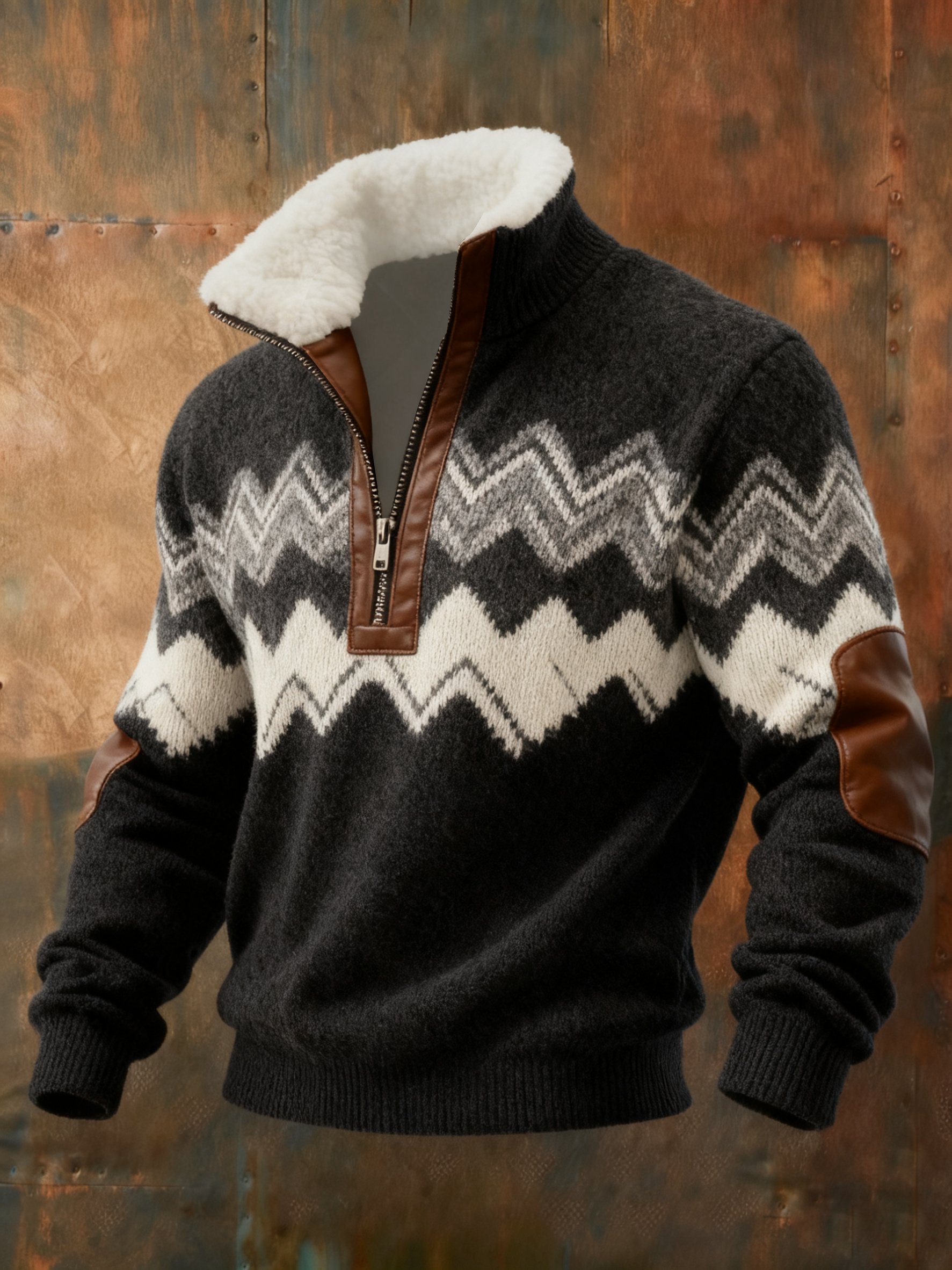 Men's Retro Western Texture Print Knit Fabric Zipper Fur Collar Long Sleeve Sweatshirt