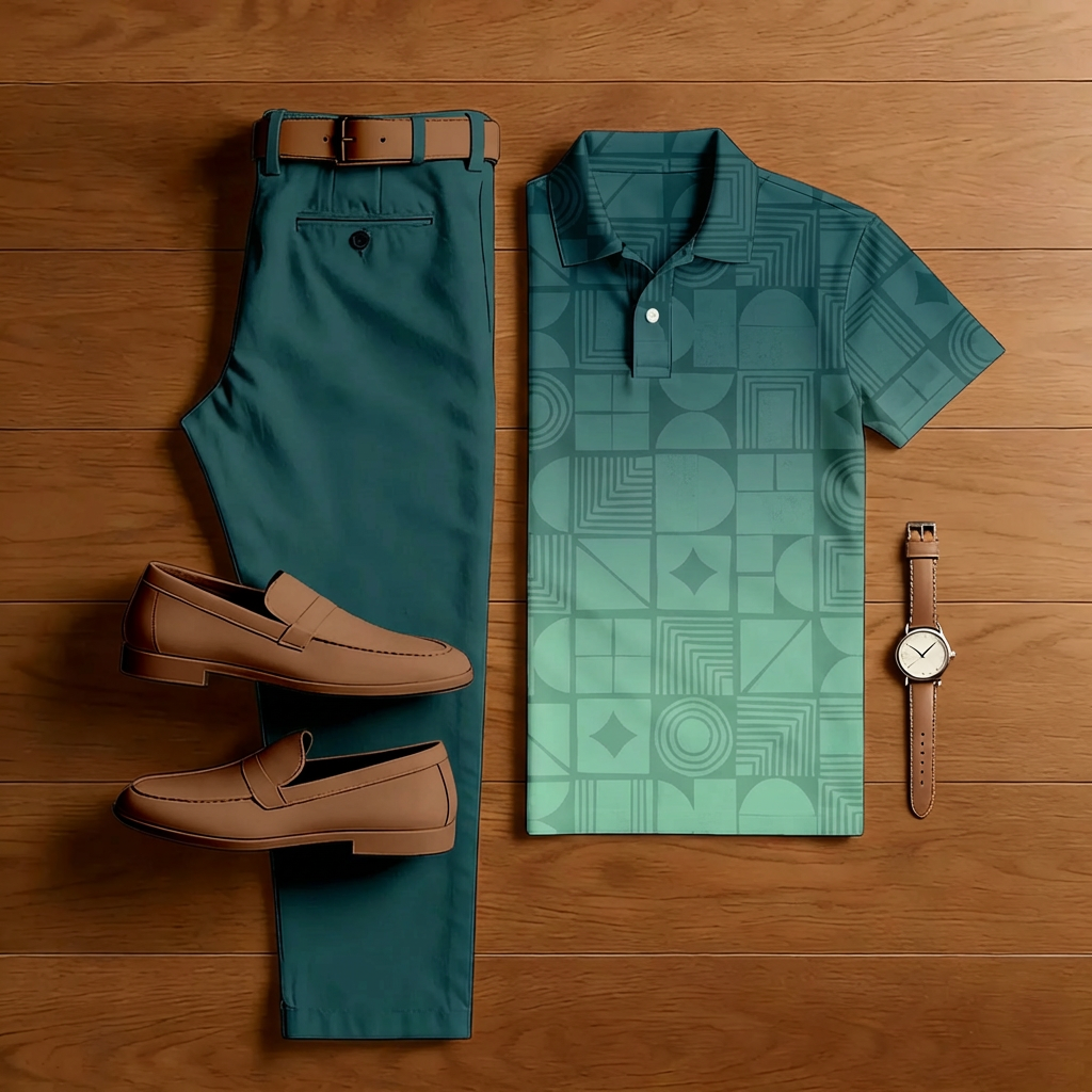Men's Casual Light Green Gradient Print Short-Sleeved Polo Shirt And Trousers Two-Piece Set
