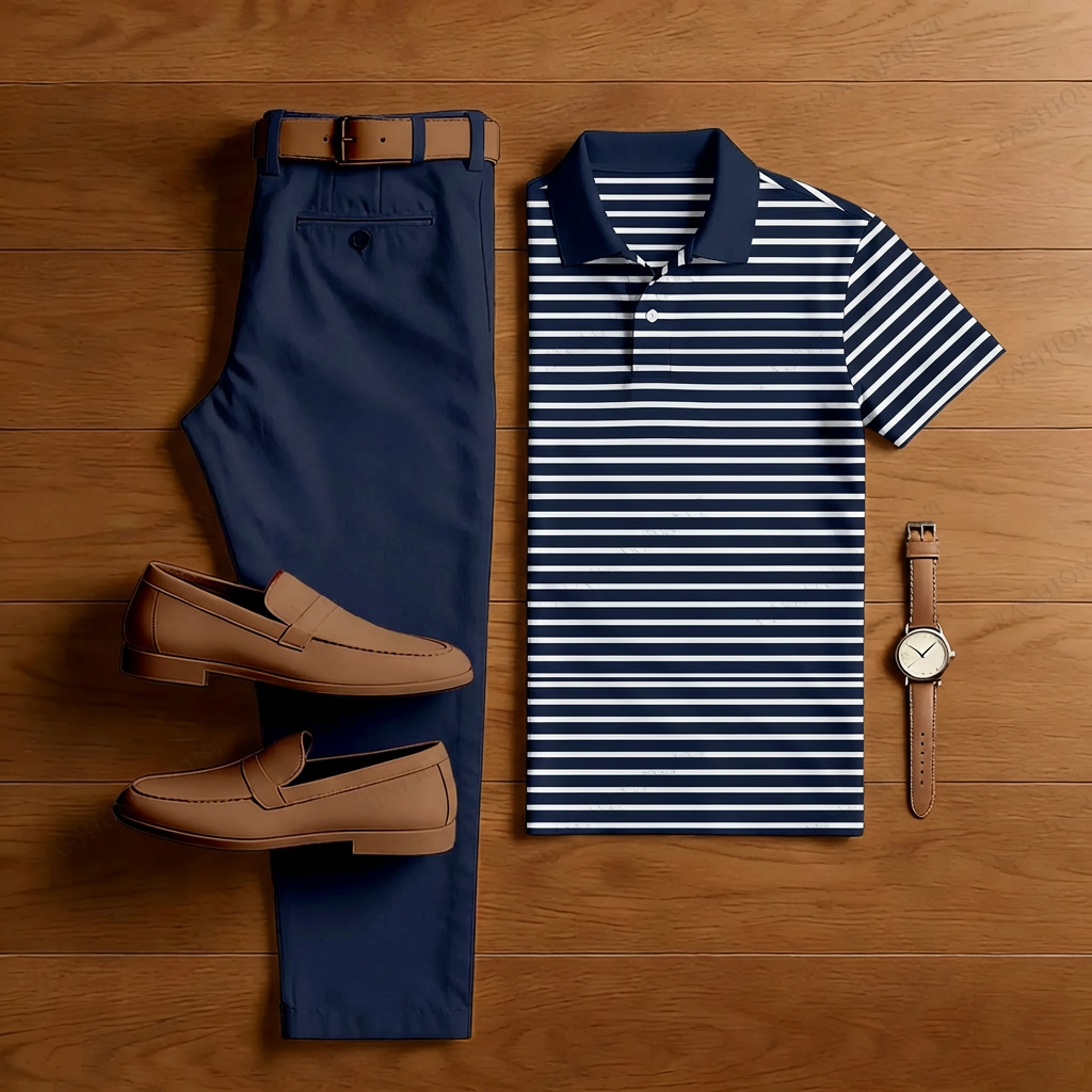 Men's Casual Blue Striped Printed Short-Sleeved Polo Shirt And Trousers Two-Piece Set