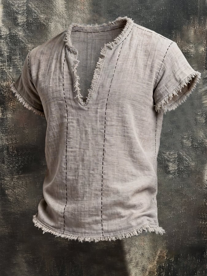 Men's Retro Cotton-Linen V-Neck Short-Sleeve T-Shirt with Raw Edges