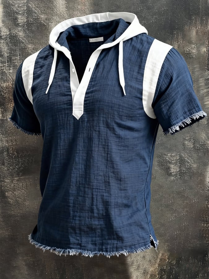 Men'S Retro Cotton-Linen Short-Sleeve Hoodie With Color-Block Paneling