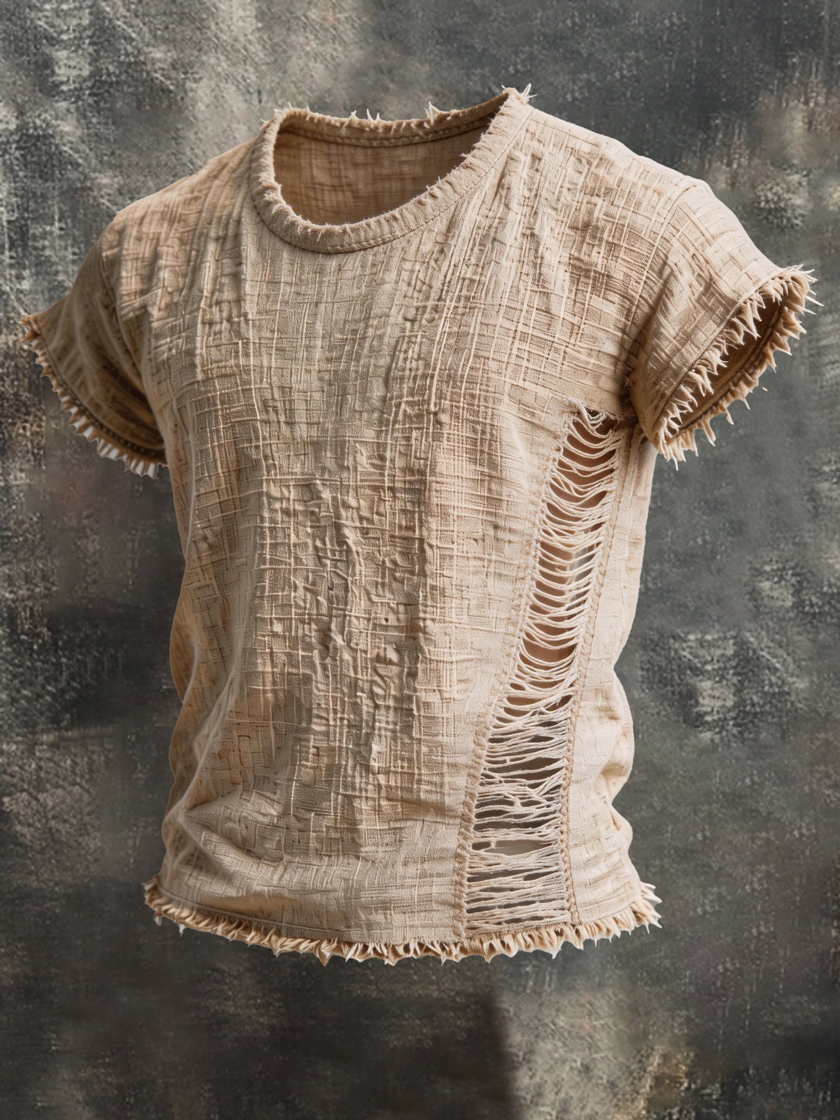 Men's Vintage Distressed Ripped Cotton-Linen Crew Neck Short-Sleeve T-Shirt