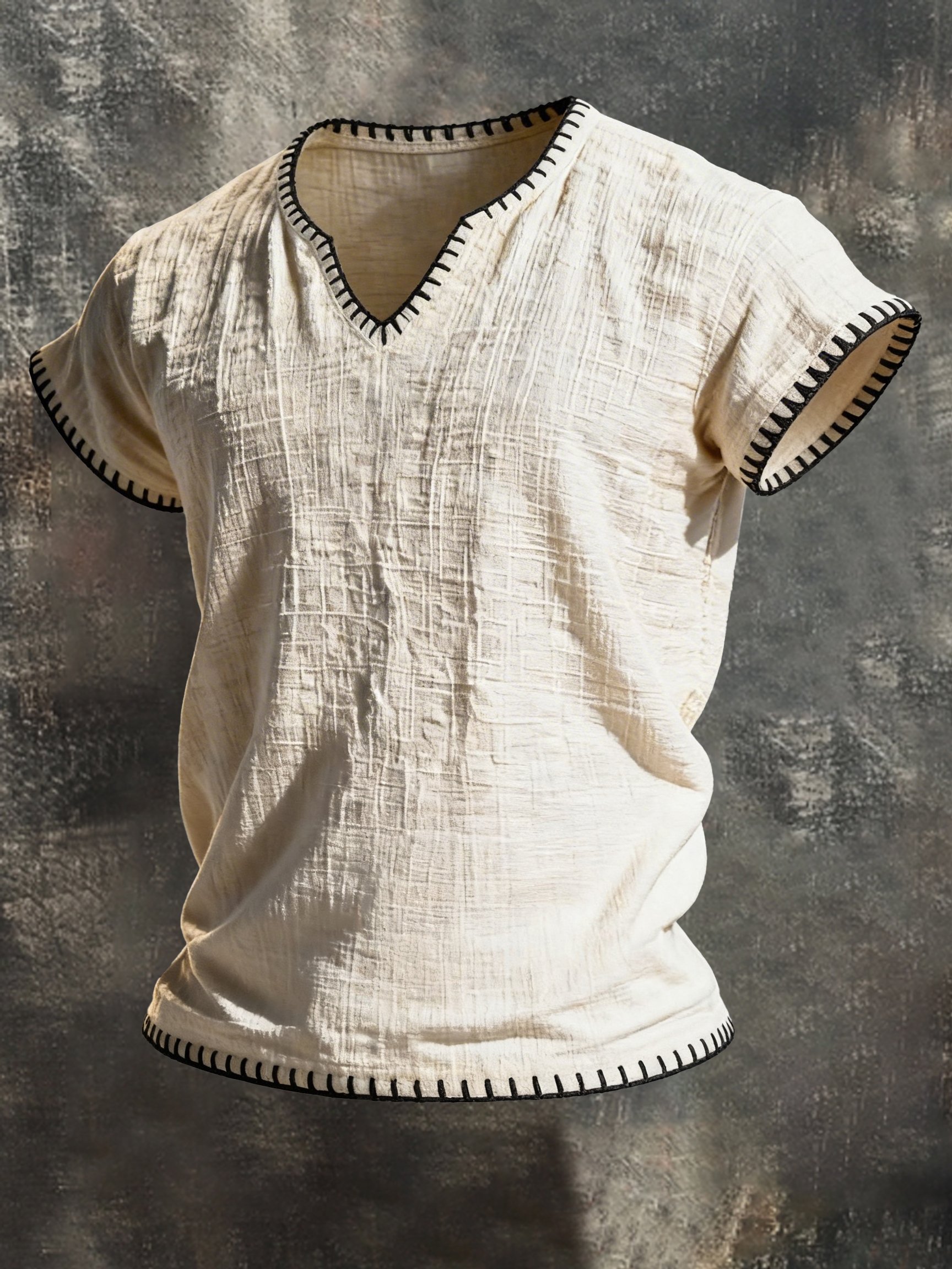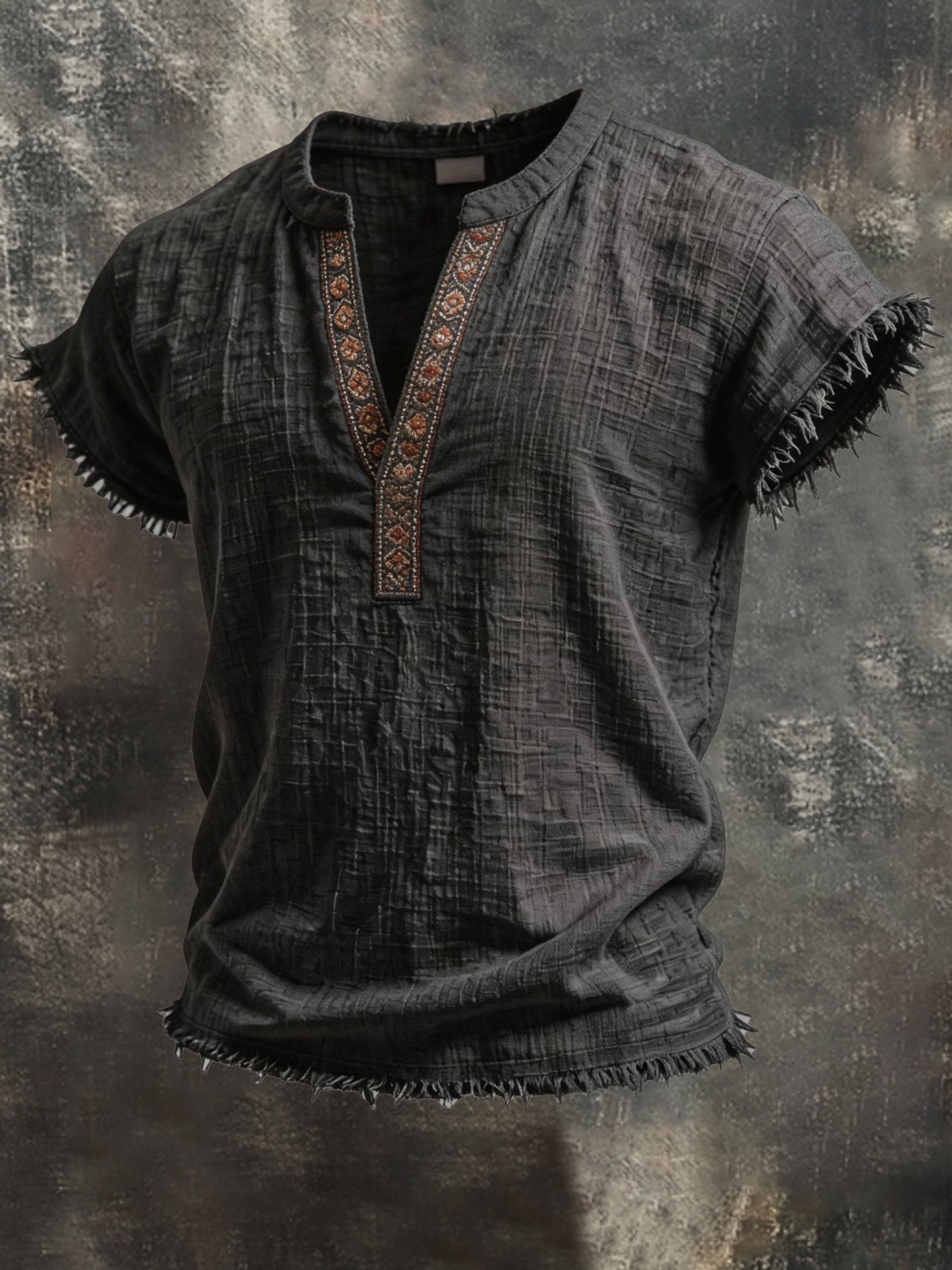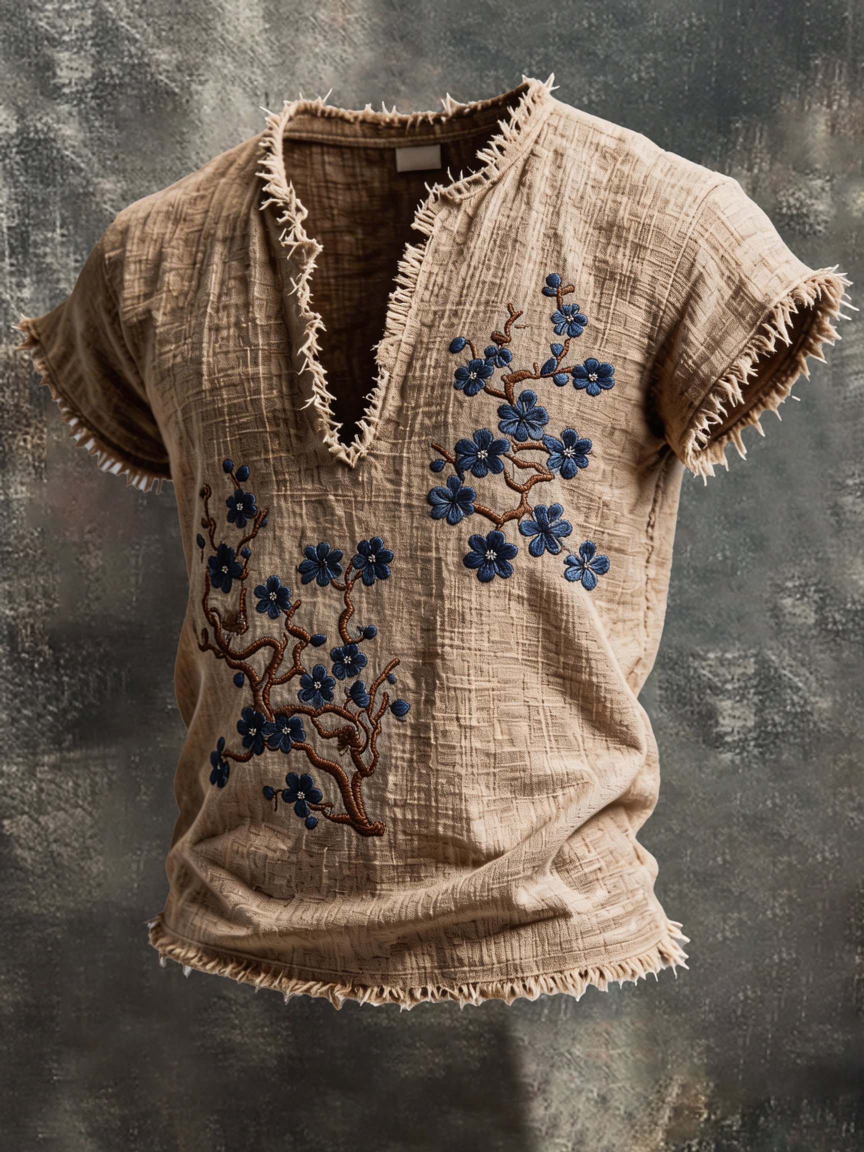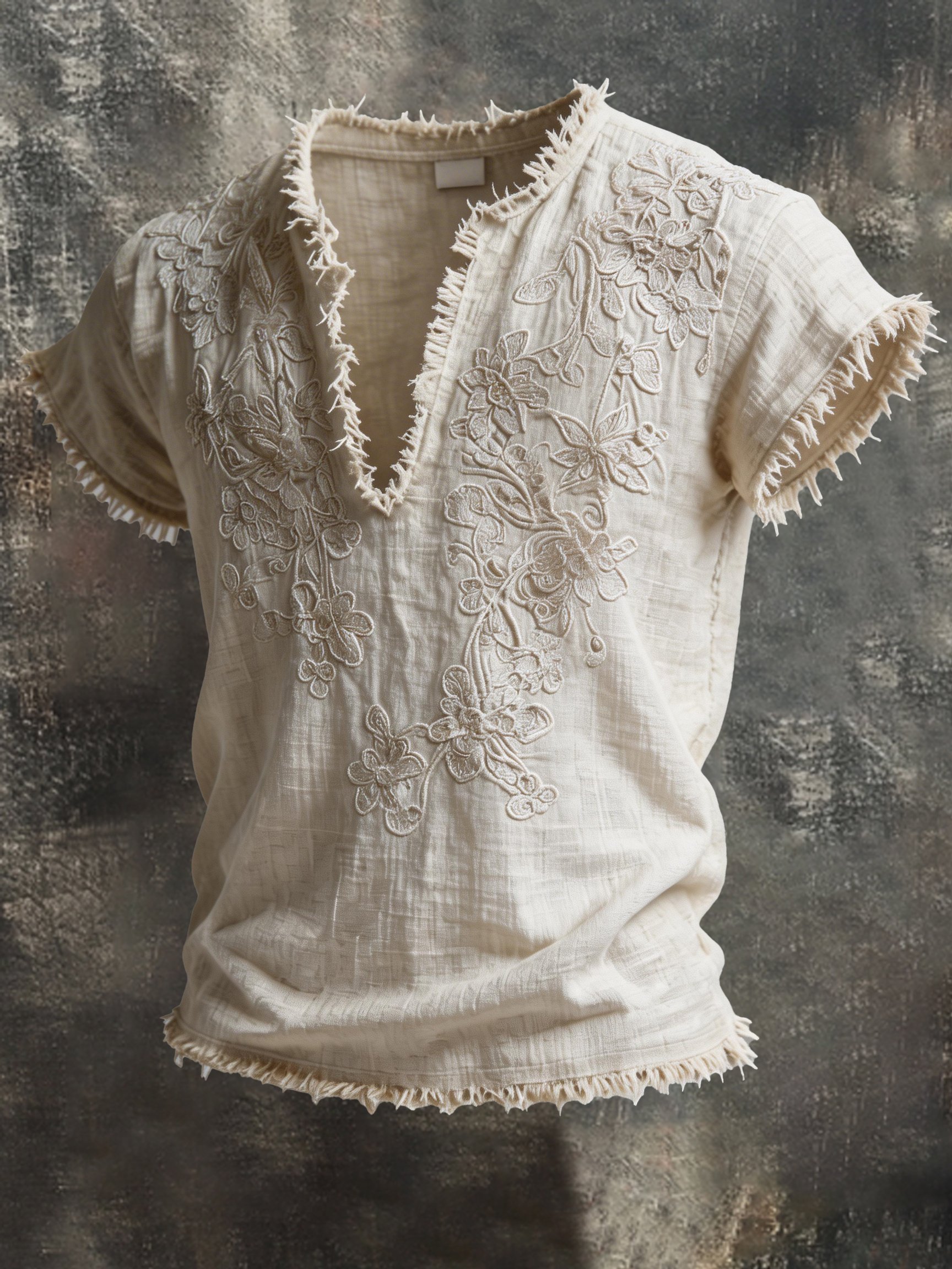 Men's Retro Cotton-Linen V-Neck Short-Sleeve T-Shirt with Embroidery and Raw Edges
