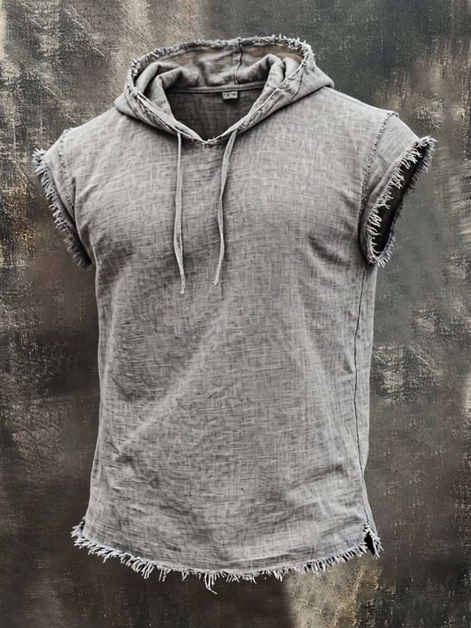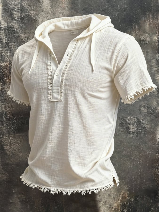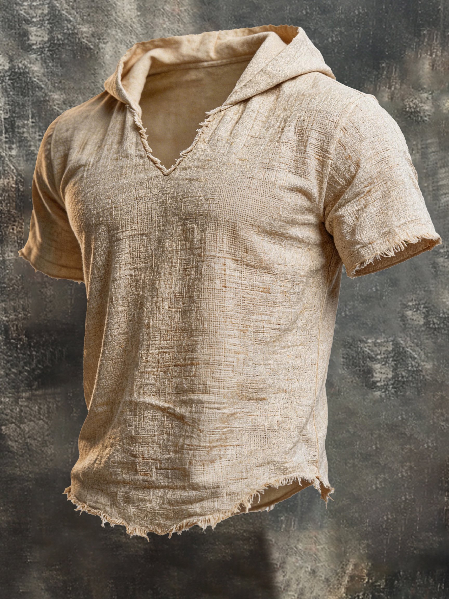Men's Retro Cotton-Linen Frayed-Hem Hooded Short-Sleeve T-Shirt