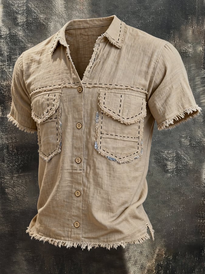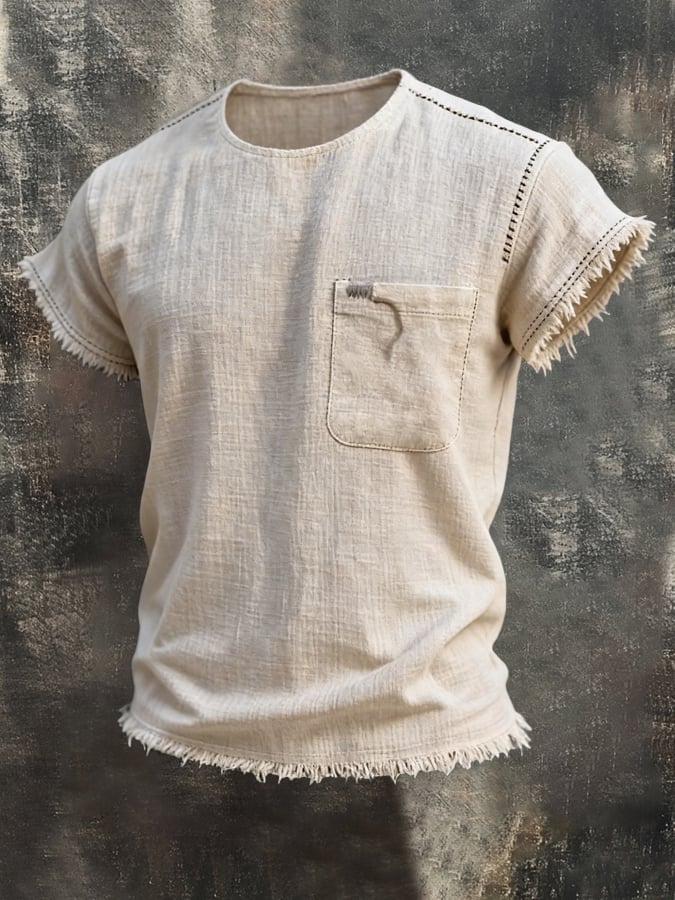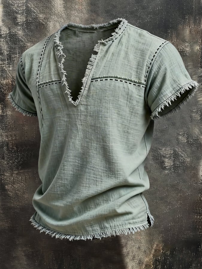 Men'S Retro Casual Vacation Short-Sleeve Top 鈥?Cotton-Linen Blend With Frayed Edges