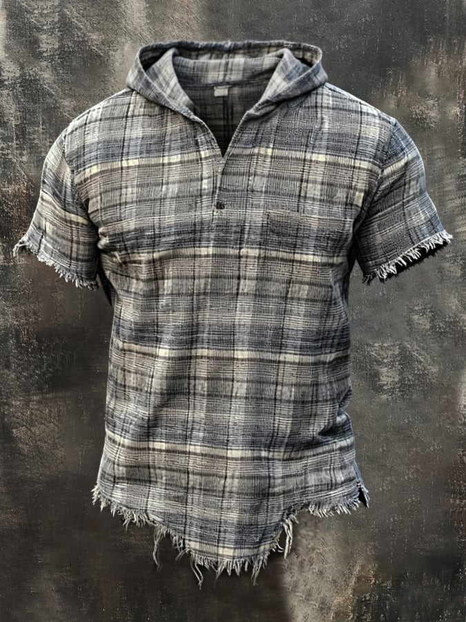 Men'S Retro Plaid Cotton-Linen Short-Sleeve Hoodie With Frayed Hem