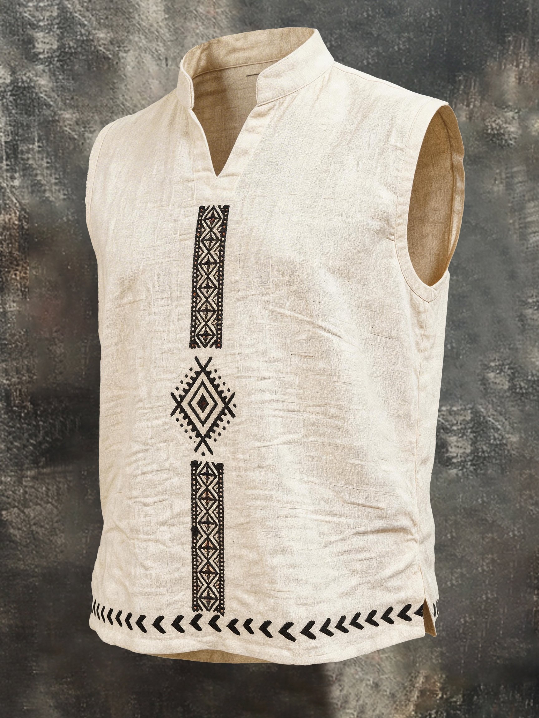 Men's Retro Ethnic-Style Cotton-Linen Sleeveless Top with Small V-Neck
