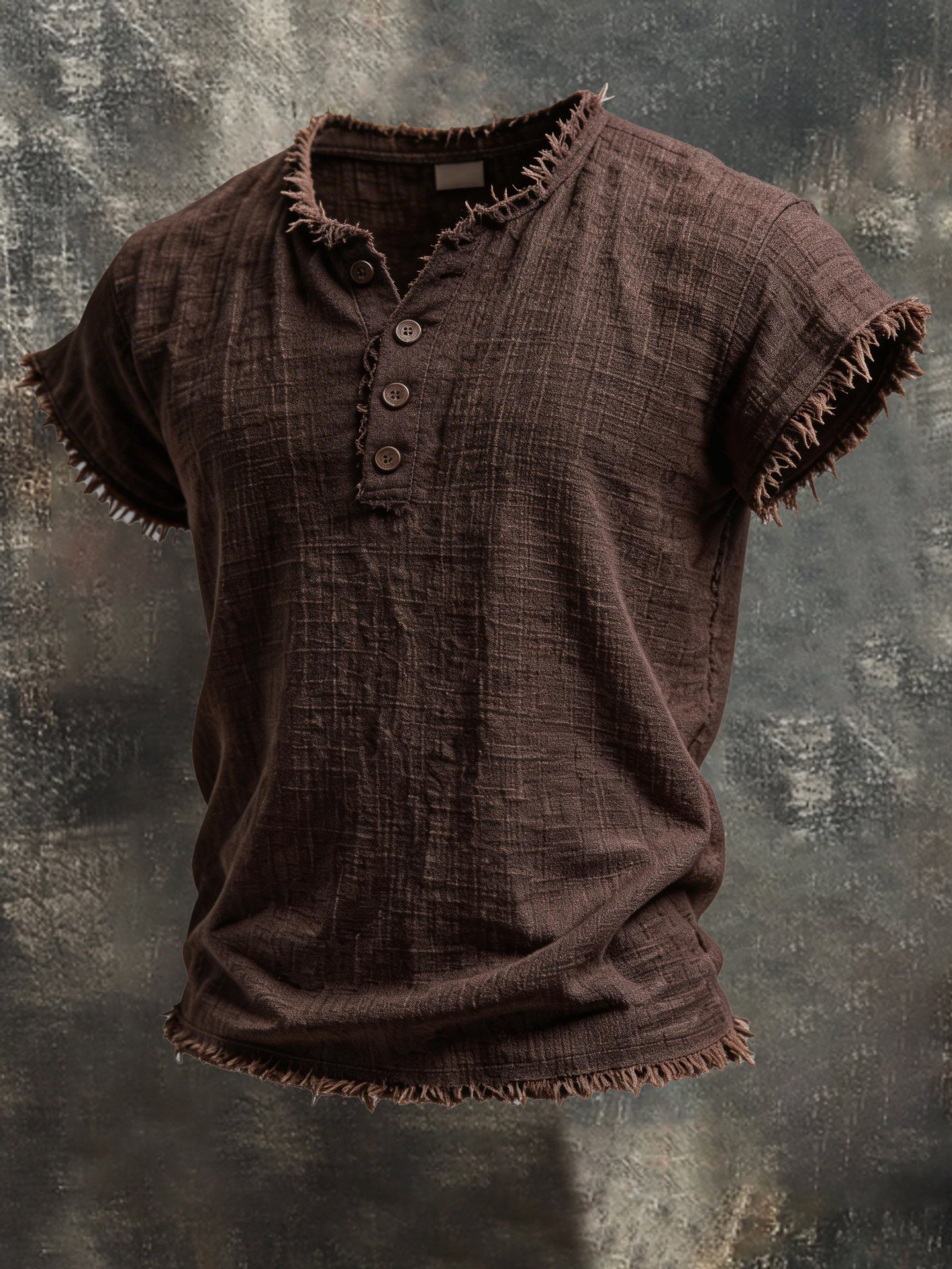 Men's Vintage-Style Cotton-Linen Short-Sleeve T-Shirt with Raw Hem and Henley Collar