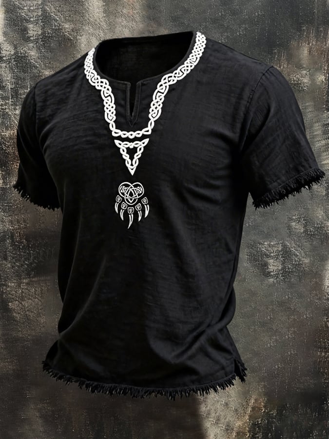 Men'S Vintage Viking-Style Short-Sleeve Top With Frayed Edges (Cotton-Linen Blend)