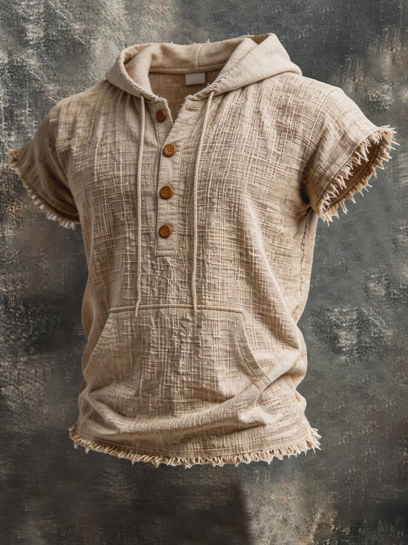 Men's Retro Cotton-Linen Short-Sleeve Hoodie with Raw Edges