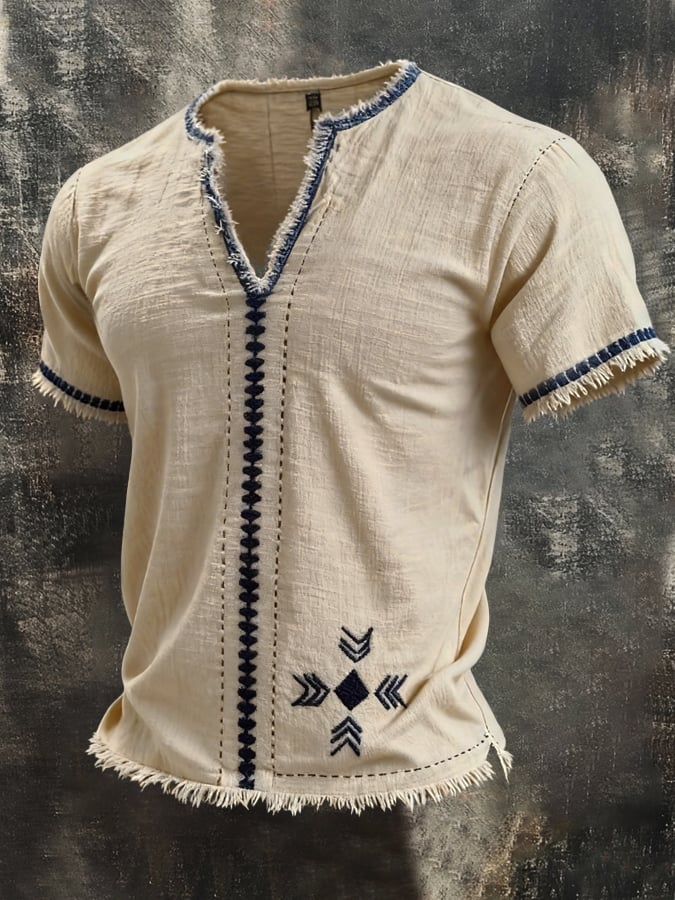 Men'S Retro Cotton-Linen Short-Sleeve Top With Embroidery And Frayed Edges