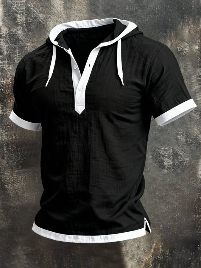 Men'S Retro Cotton-Linen Short-Sleeve Hoodie With Color-Block Paneling