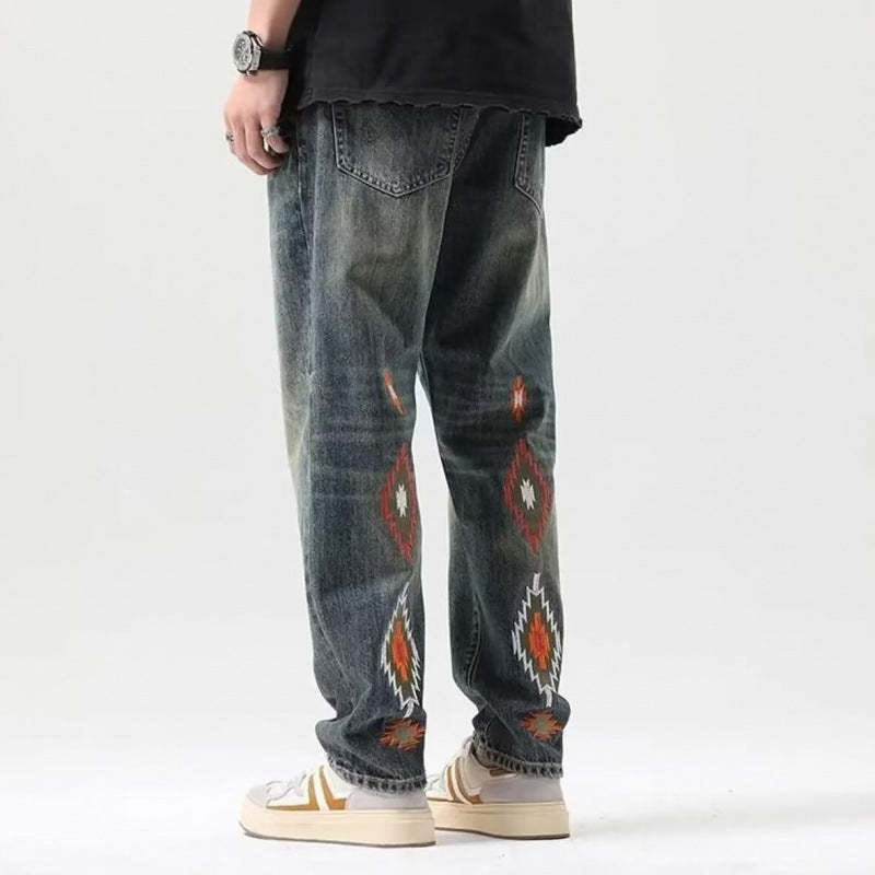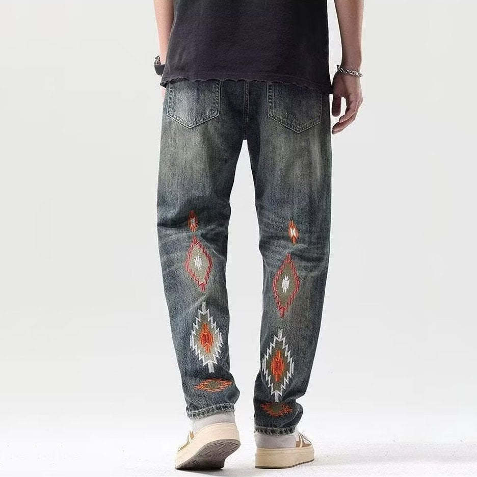 Designed with bold, Aztec-inspired stitching and a soft vintage wash, these jeans offer the perfect blend of comfort and style for a piece that's as eye-catching as it is unforgettable.