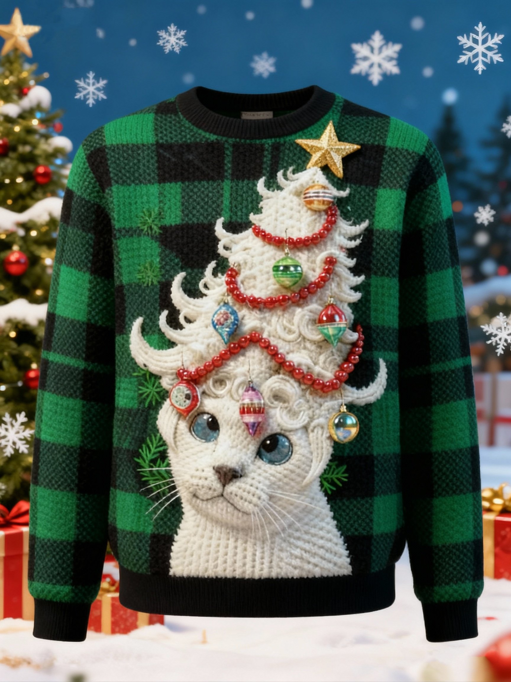 Men's Cartoon Cute Cat Print Ugly Christmas Tree Pullover Sweater