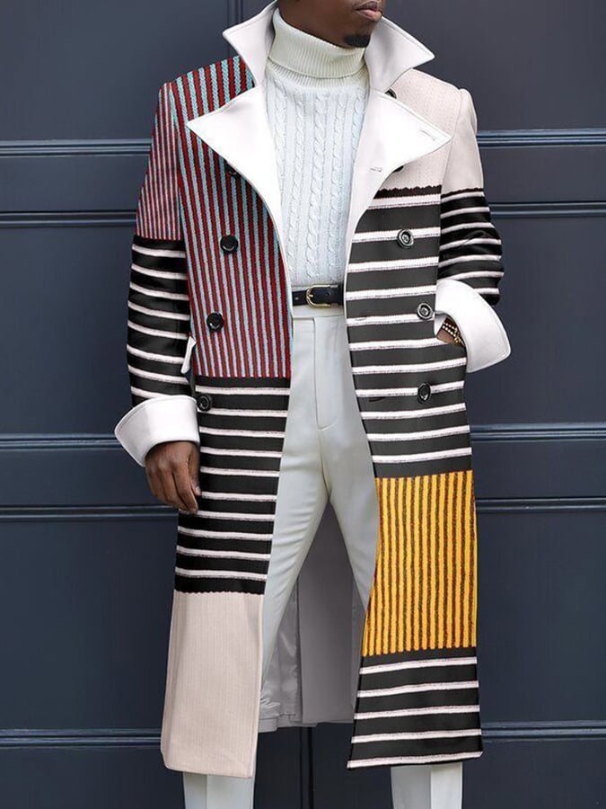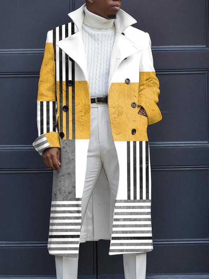 Men's Fashion Geometric Print Double Breasted Casual Windbreaker Coat