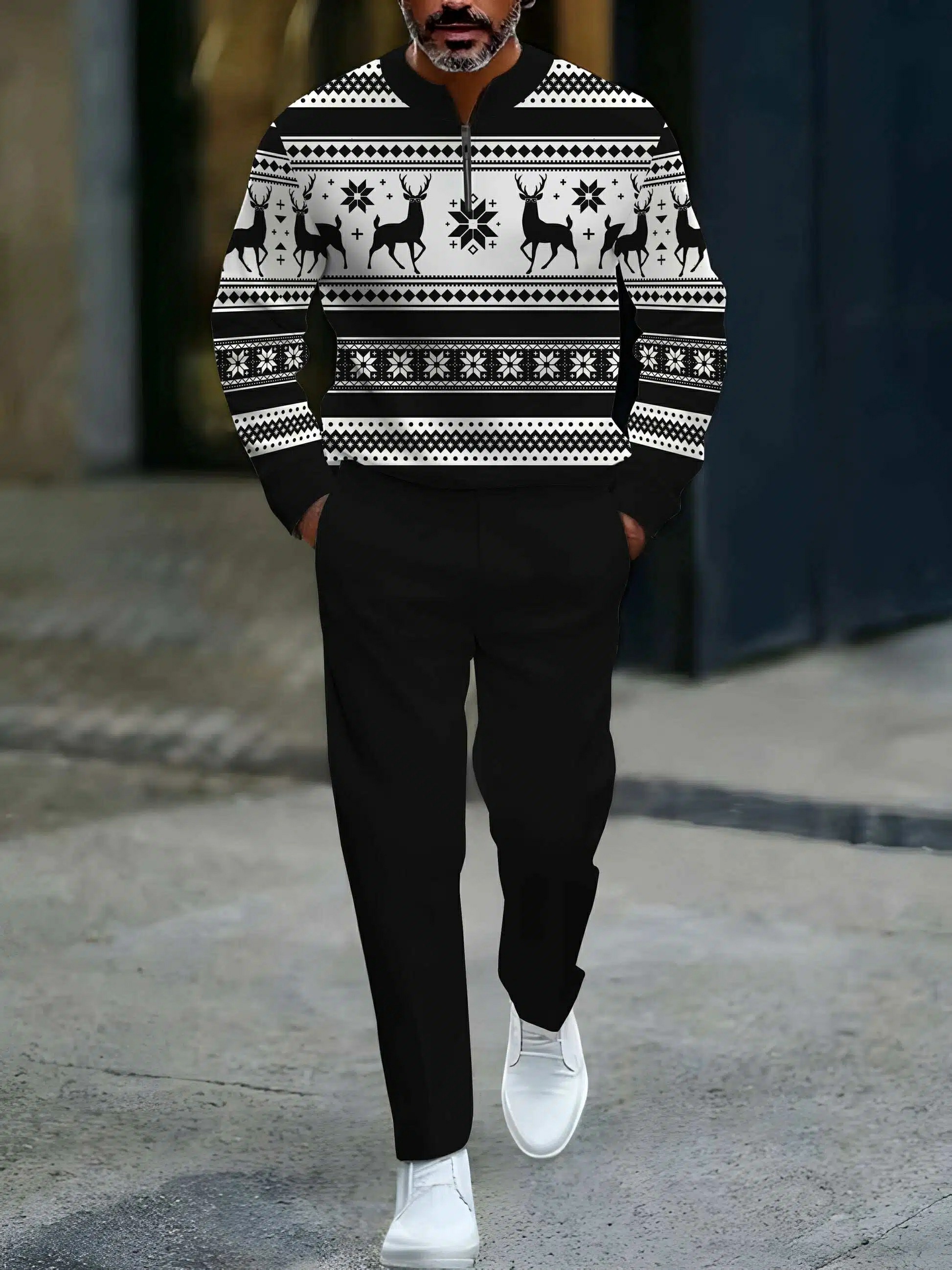 Men's Casual Black & White Color Matching Christmas Elk Pattenr Round-Neck Zipper Long Sleeved Sweatshirt & Trousers Two-Piece Set