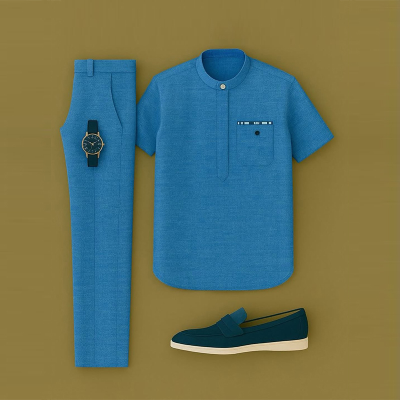 Men's Casual Blue Color Short Sleeved Henry Collar T-Shirt & Trousers Two-Piece Set