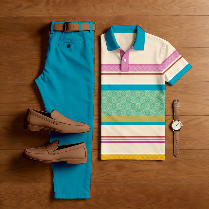 Men's Casual Blue & Khaki Color Matching Striped Printed Short Sleeved Polo Shirt & Trousers Two-Piece Set