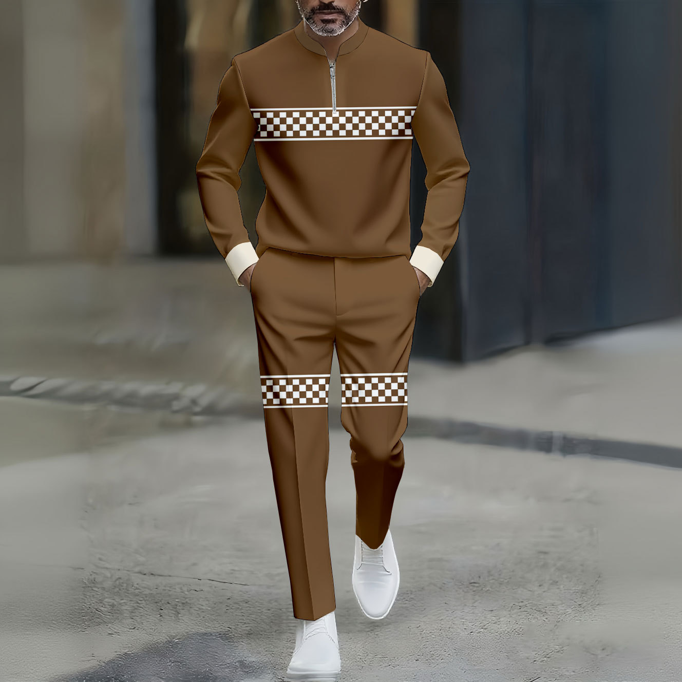 Men's Casual Coffee & White Color Matching Checked Printed Round-Neck Zipper Long Sleeved Trousers Two-Piece Set