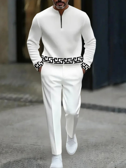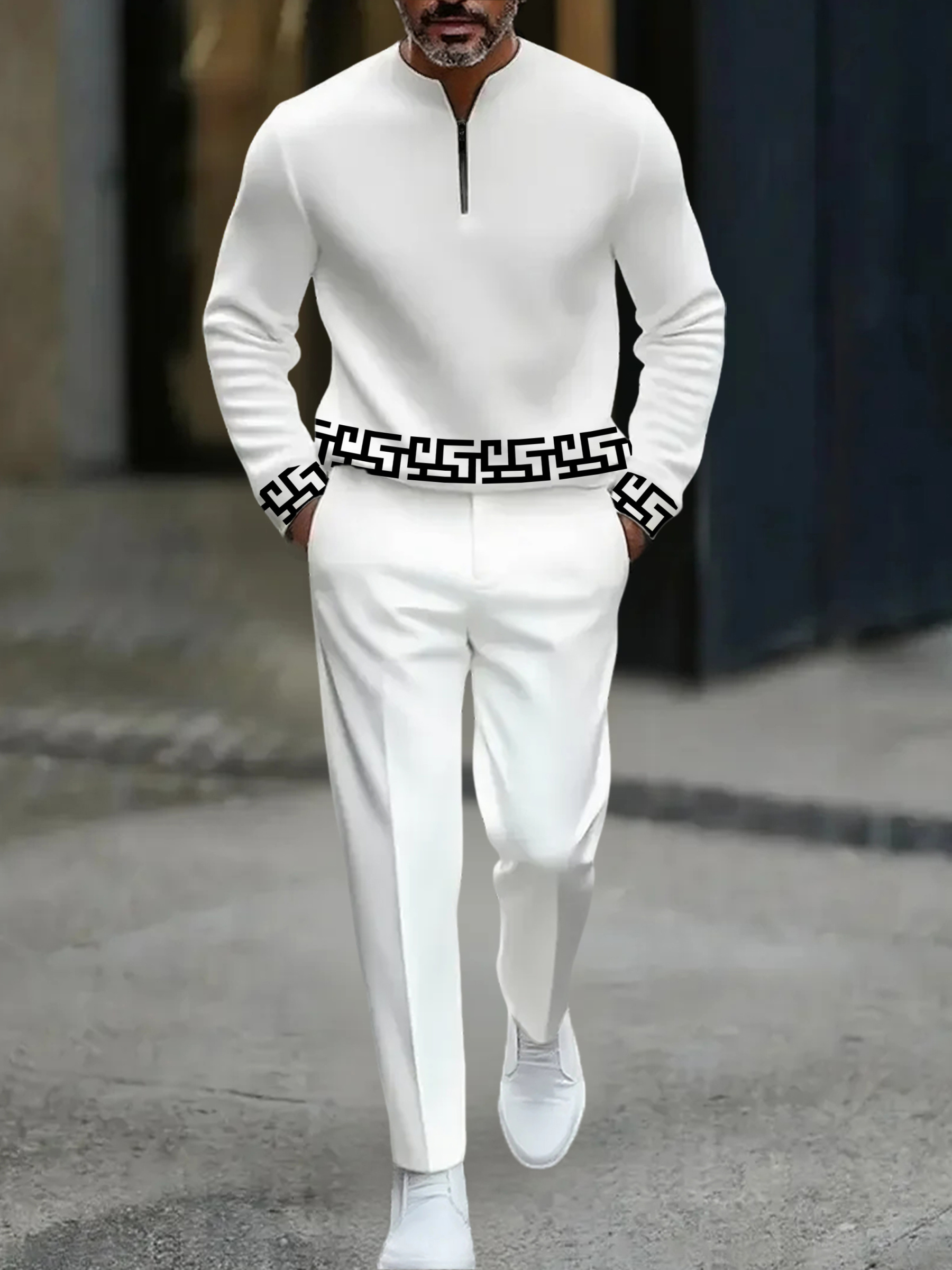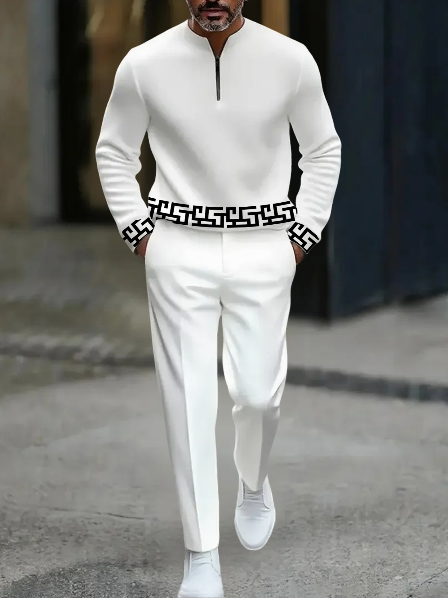 Men's Casual Black & White Color Matching Geometric Printed Round-Neck Zipper Long Sleeved Sweatshirt & Trousers Two-Piece Set