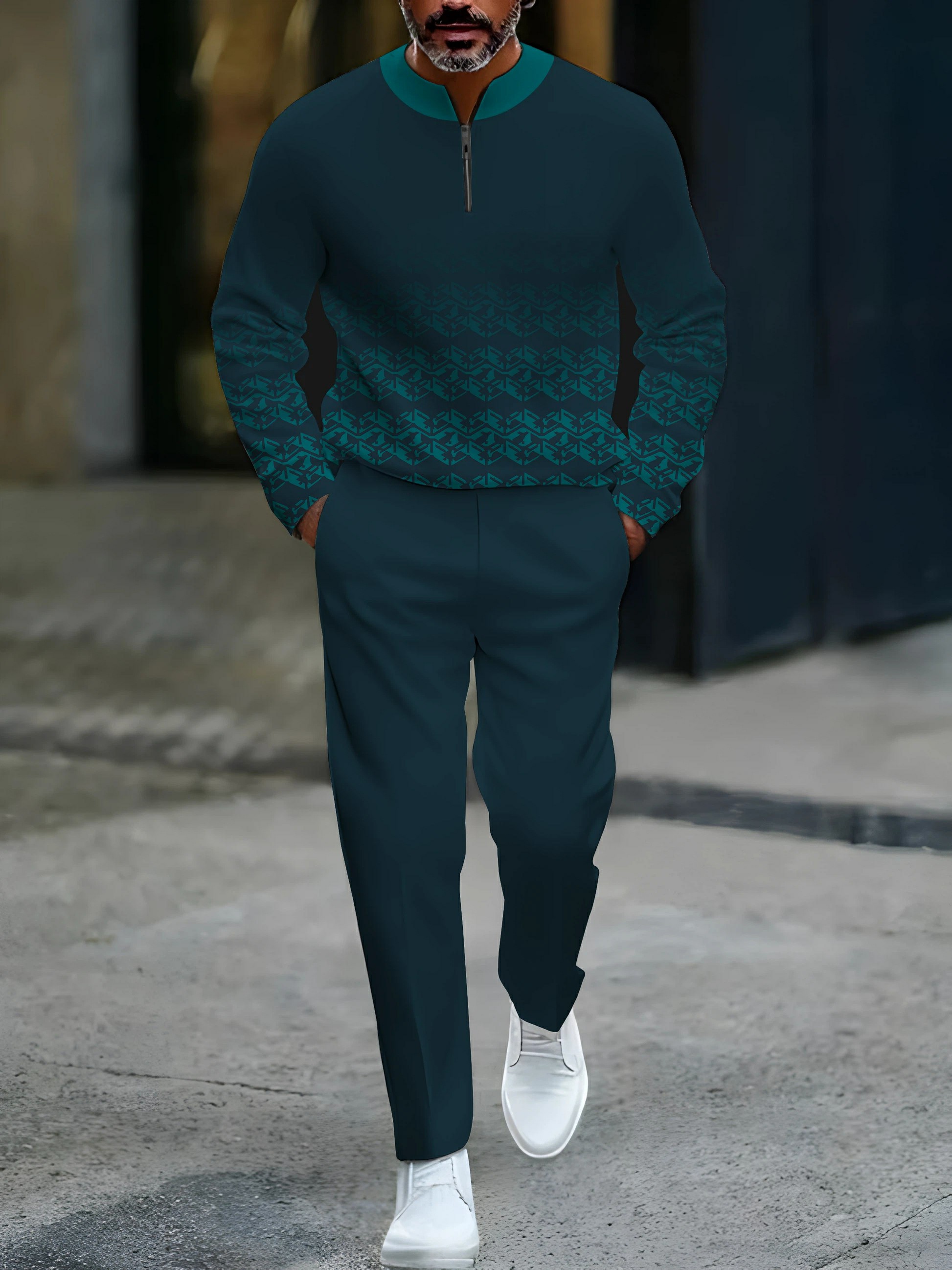Men's Casual Green Color Matching Gradien Vintage Printed Round-Neck Zipper Long Sleeved Tops & Trousers Two-Piece Set