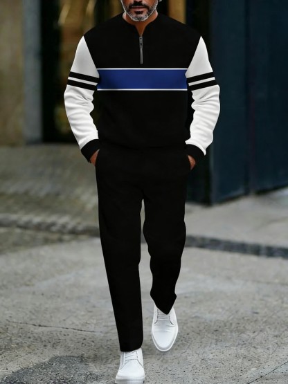 Men's Casual Black & Royal Color Matching Striped Printed Round-Neck Zipper Long Sleeved Tops & Trousers Two-Piece Set