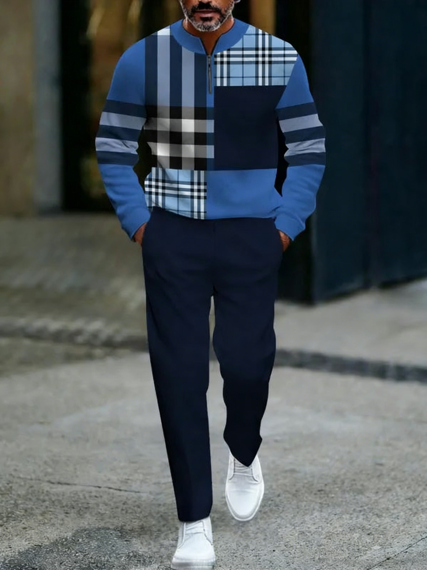 Men's Casual Blue & Navy Checked Patchwork Printed Round-Neck Zipper Long Sleeved Tops & Trousers Two-Piece Set