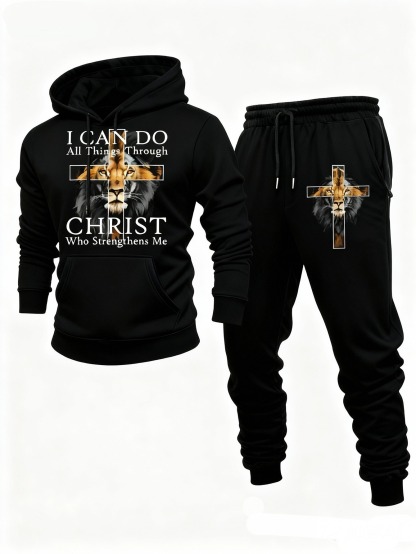 Men's Casual Black & Lion Color Matching Printed Hoodies Long Sleeved Sweatshirts & Sweatpants Two-Piece Set