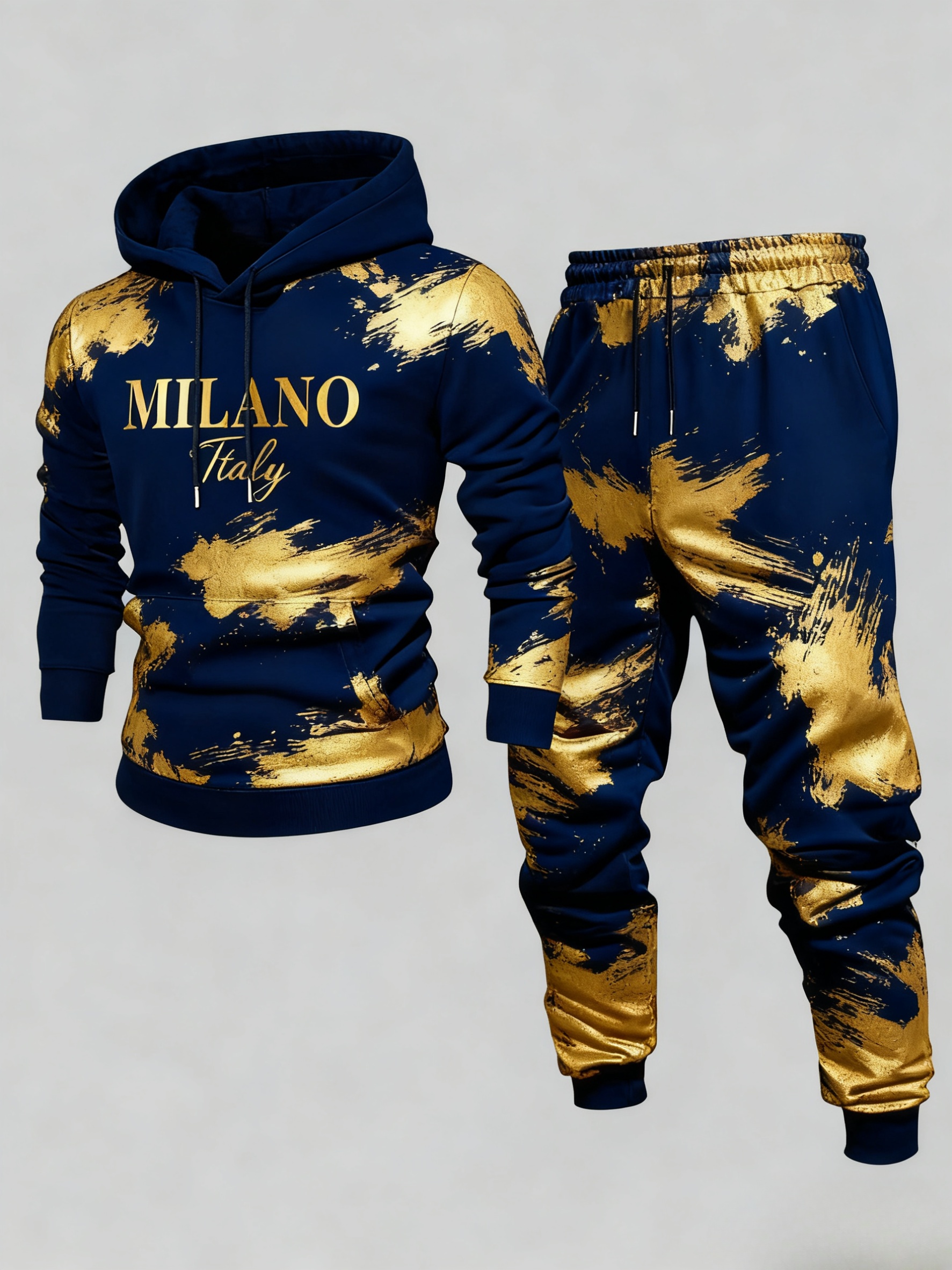 Men's Casual Navy Blue & Gold Color Matching Printed Hoodies Long Sleeved Sweatshirts & Sweatpants Two-Piece Set