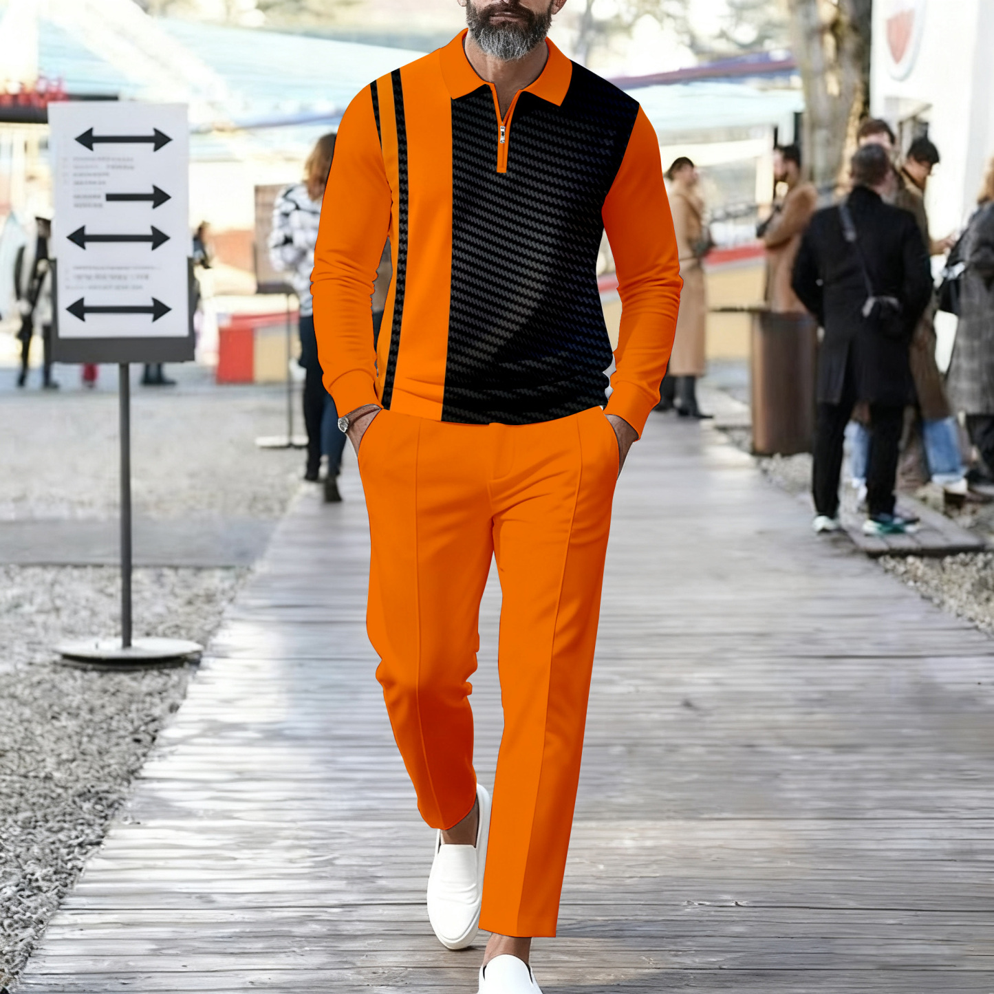Men's Casual Color Matching Printed Polo-Collar Zipper Long Sleeved Trousers Two-Piece Set