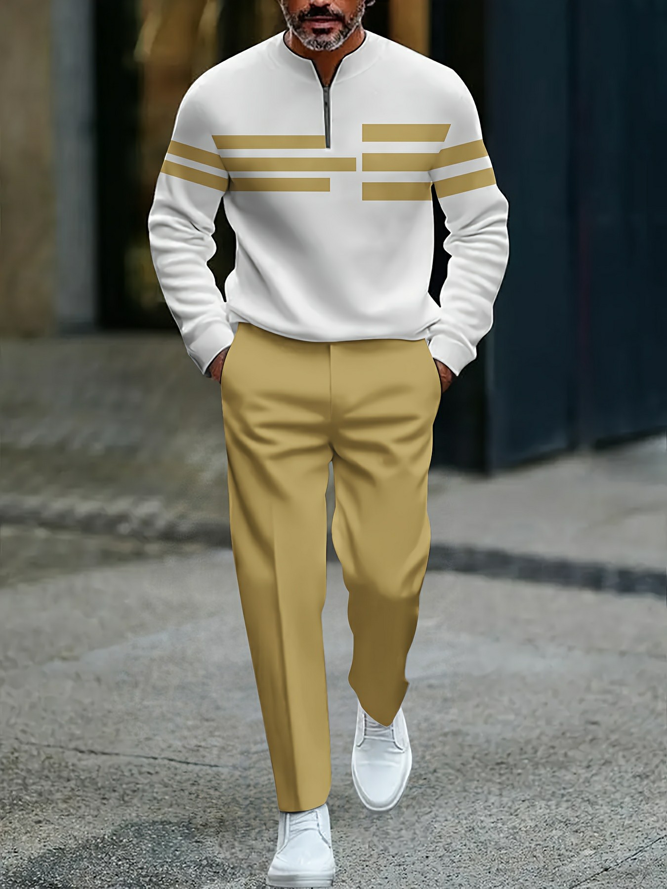Men's Casual Yellow & White Color Matching Striped Printed Round-Neck Zipper Long Sleeved Trousers Two-Piece Set