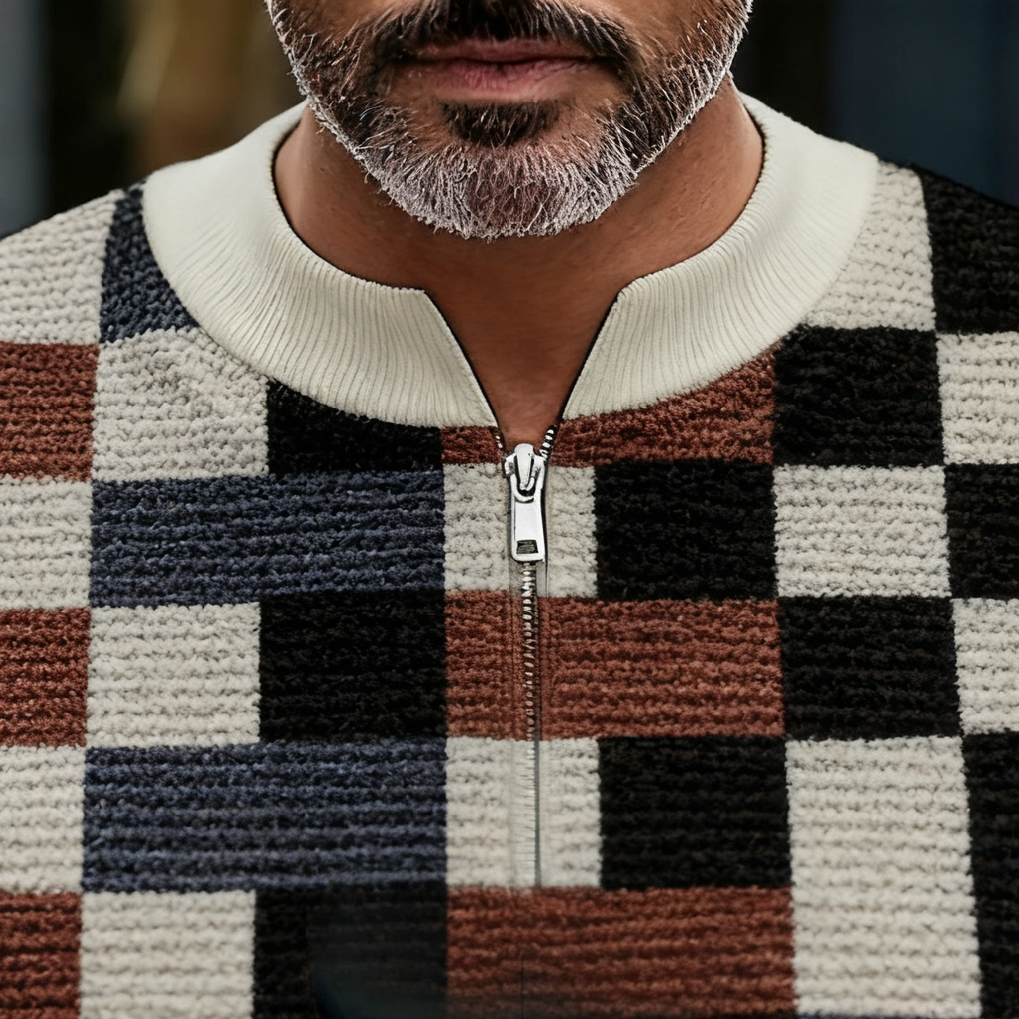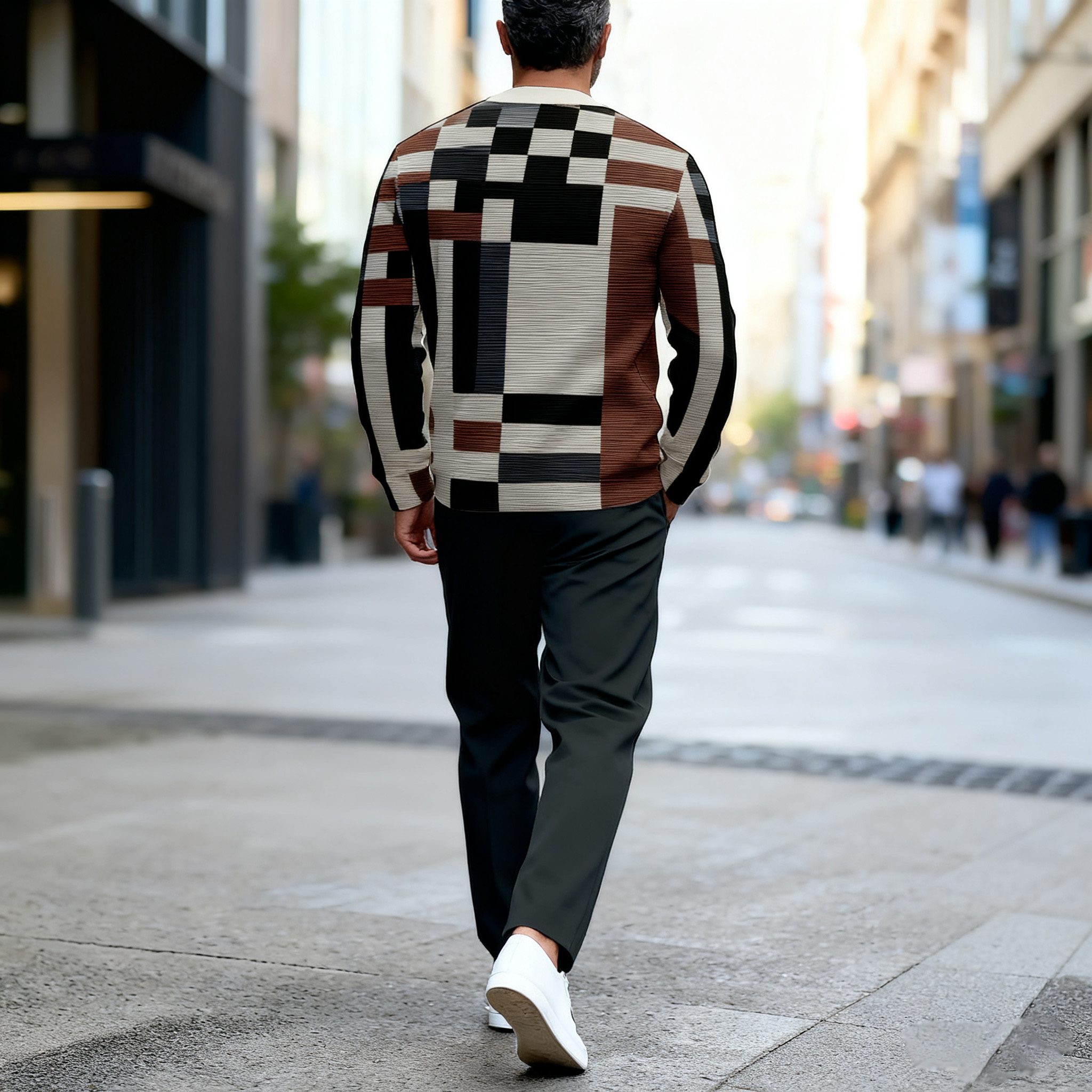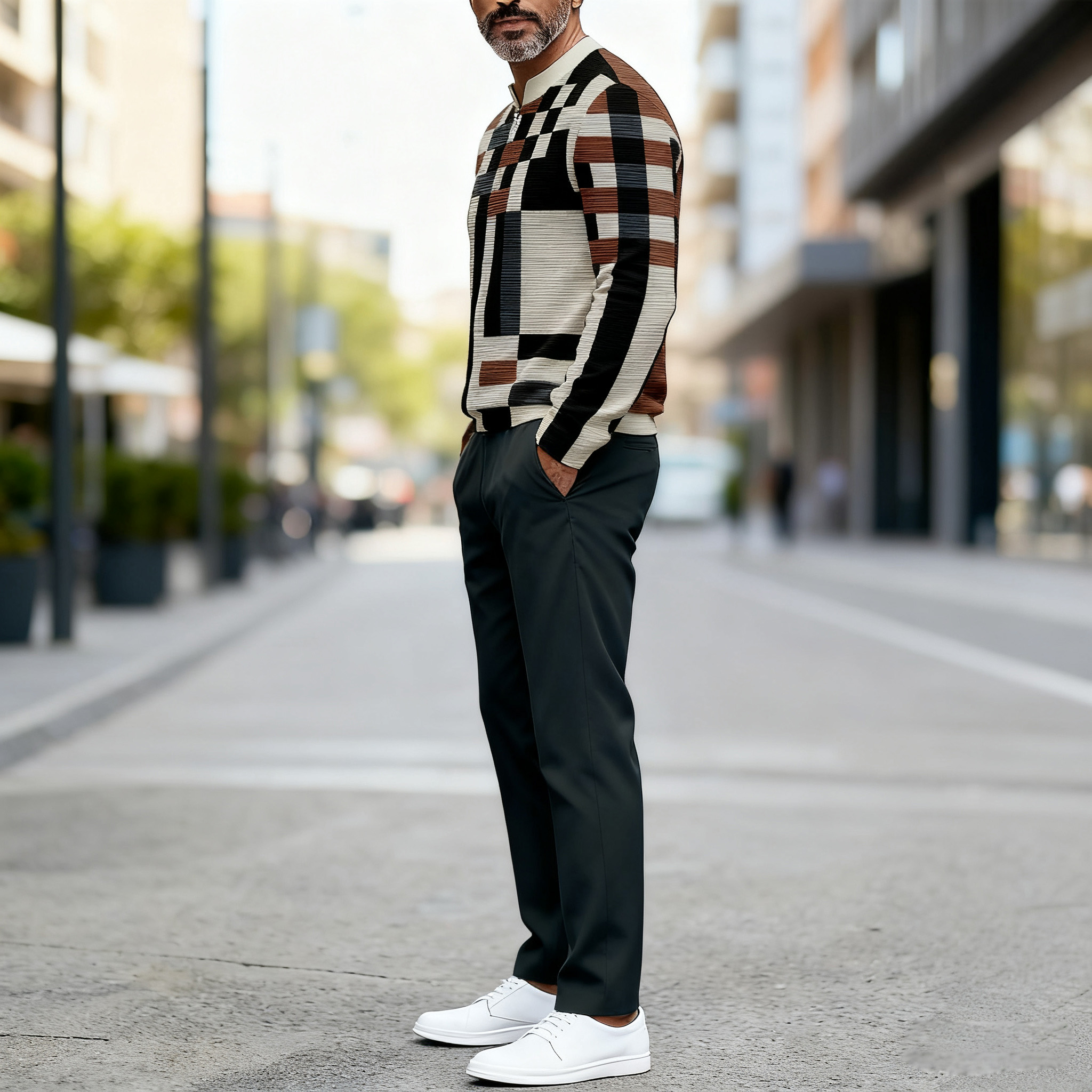 Men's Casual Color Matching Printed Round-Neck Zipper Long Sleeved Trousers Two-Piece Set
