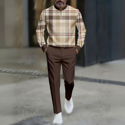 Men's Coffee & Khaki Casual Color Matching Checked Printed Round-Neck Zipper Long Sleeved Trousers Two-Piece Set