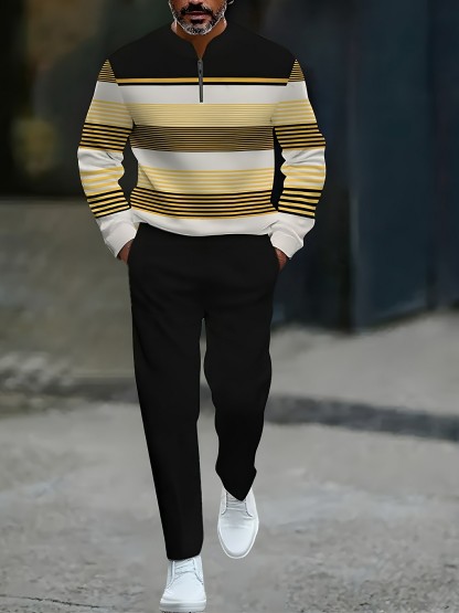 Men's Casual Black & Yellow Color Matching Striped Printed Round-Neck Zipper Long Sleeved Trousers Two-Piece Set