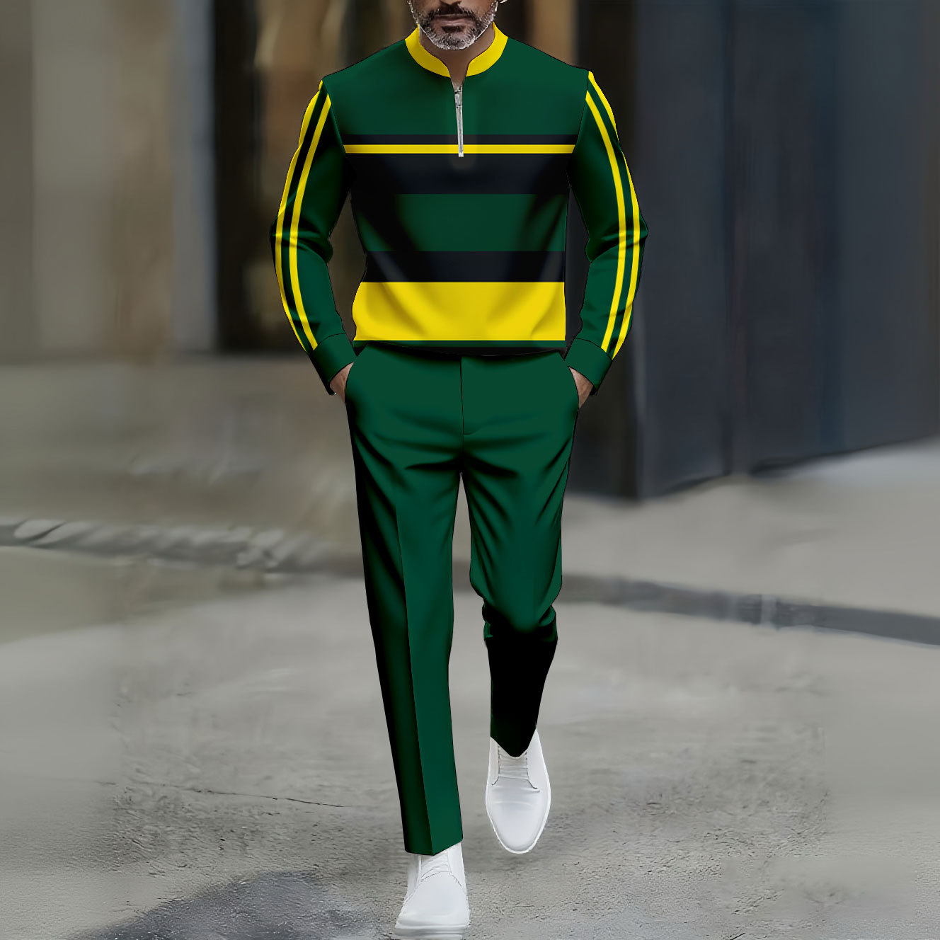 Men's Casual Color Matching Striped Printed Round-Neck Zipper Long Sleeved Trousers Green Two-Piece Set