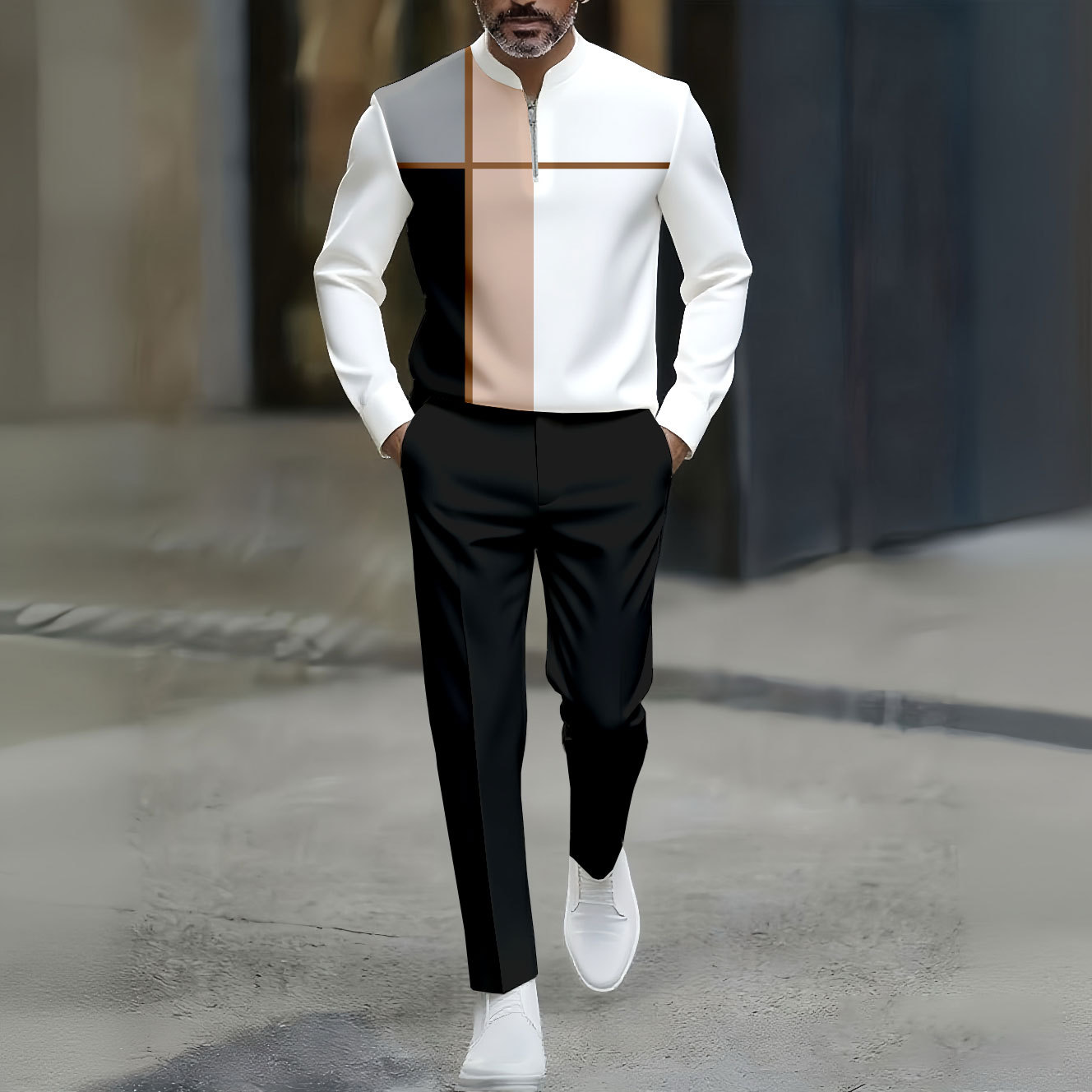 Men's Casual Black & White Color Matching Asymmetric Striped Printed Round-Neck Zipper Long Sleeved Trousers Two-Piece Set