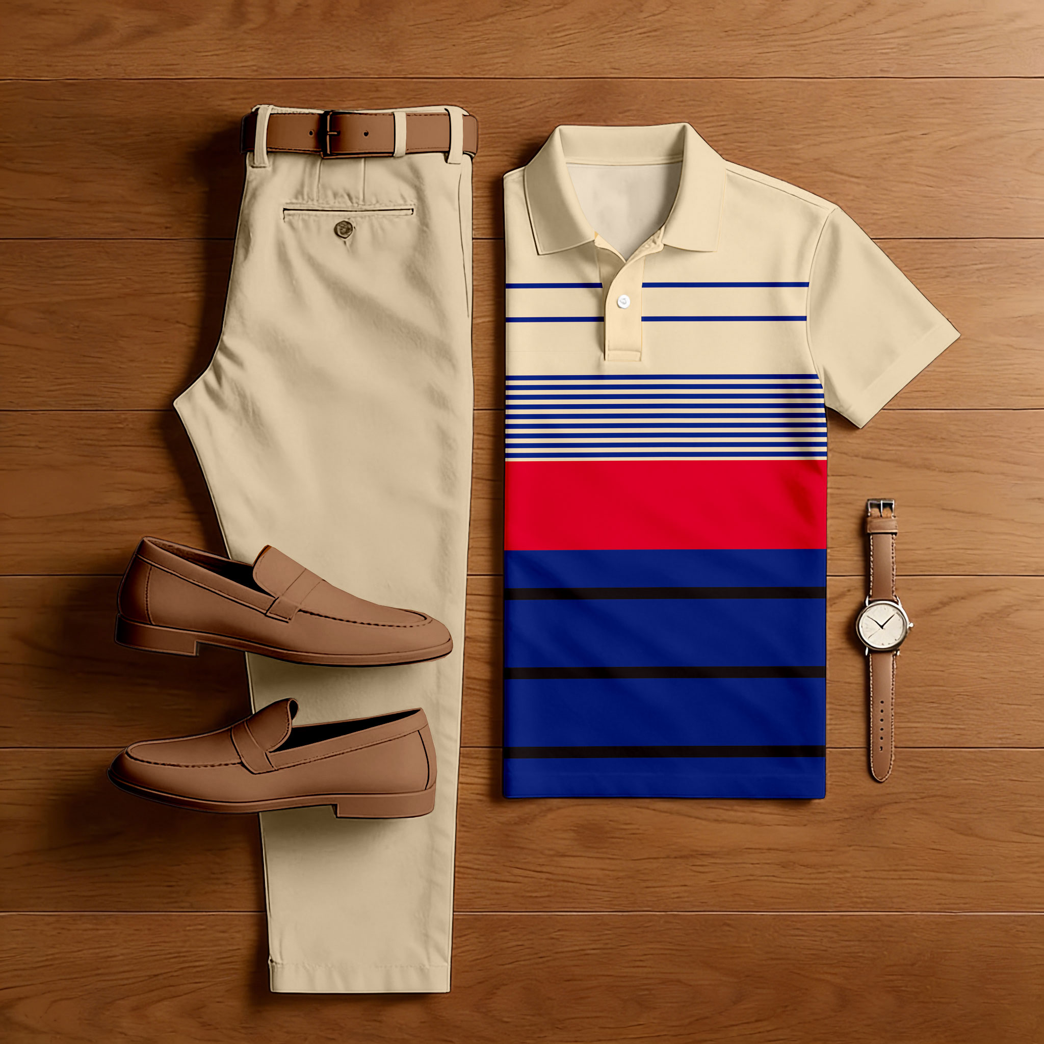 Men's Casual Khaki & Navy Blue & Red Color Matching Striped Printed Short Sleeved Polo Shirt & Trousers Two-Piece Set