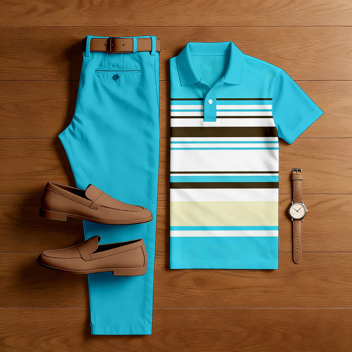 Men's Casual Blue & White Color Matching Striped Printed Short Sleeved Polo Shirt & Trousers Two-Piece Set