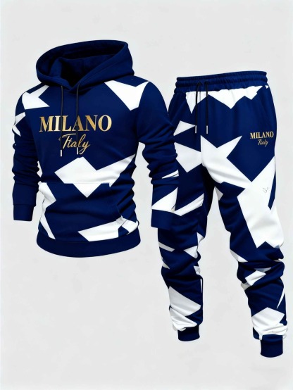 Men's Casual Navy & White Color Matching Geoemtric Printed Hoodies Long Sleeved Sweatshirts & Sweatpants Two-Piece Set