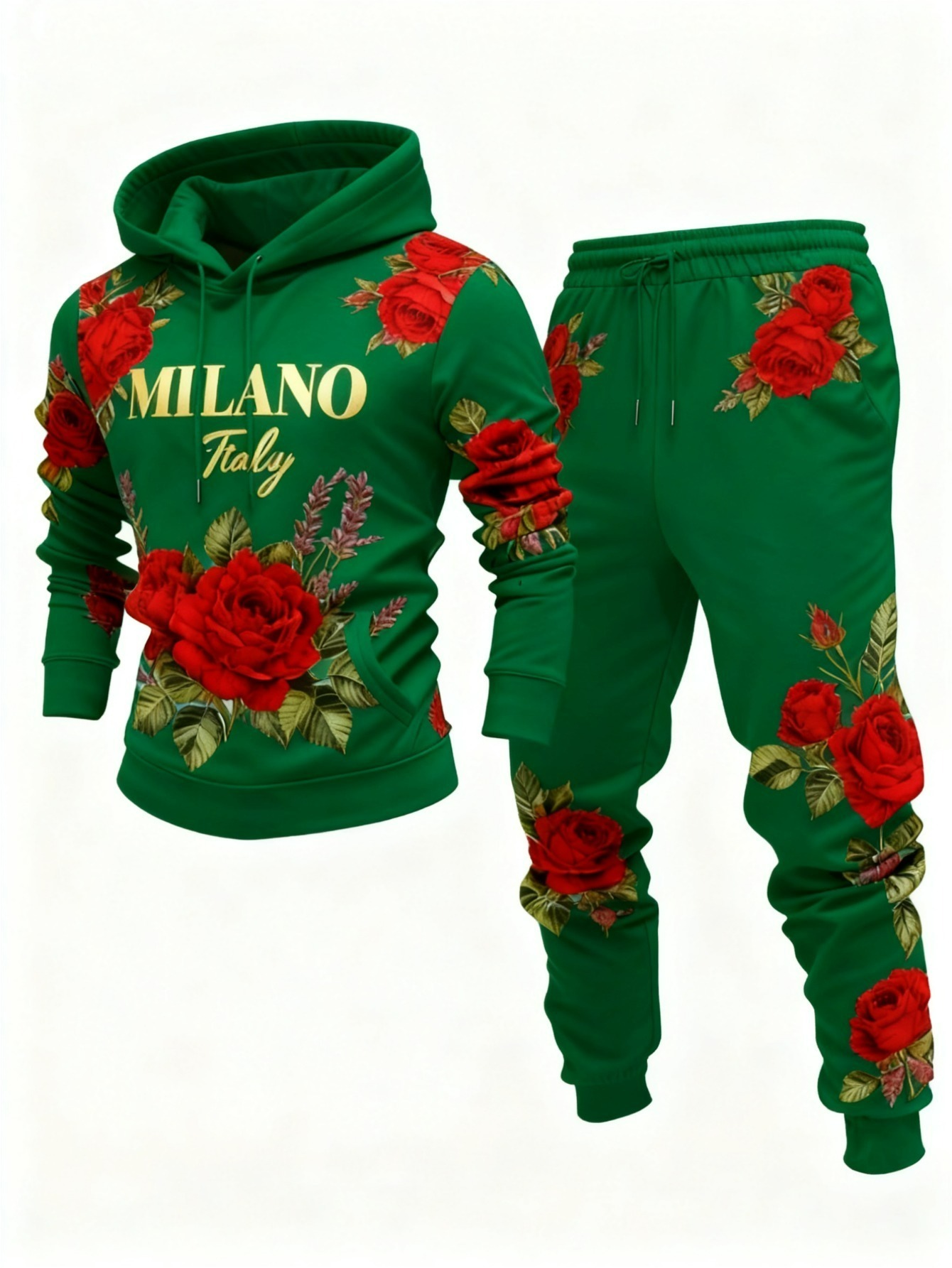 Men's Casual Green & Red Rose Printed Hoodies Long Sleeved Sweatshirts & Sweatpants Two-Piece Set
