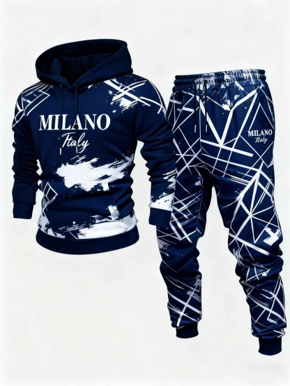 Men's Casual Navy Blue & White Color Geometrc Printed Hoodies Long Sleeved Sweatshirts & Sweatpants Two-Piece Set