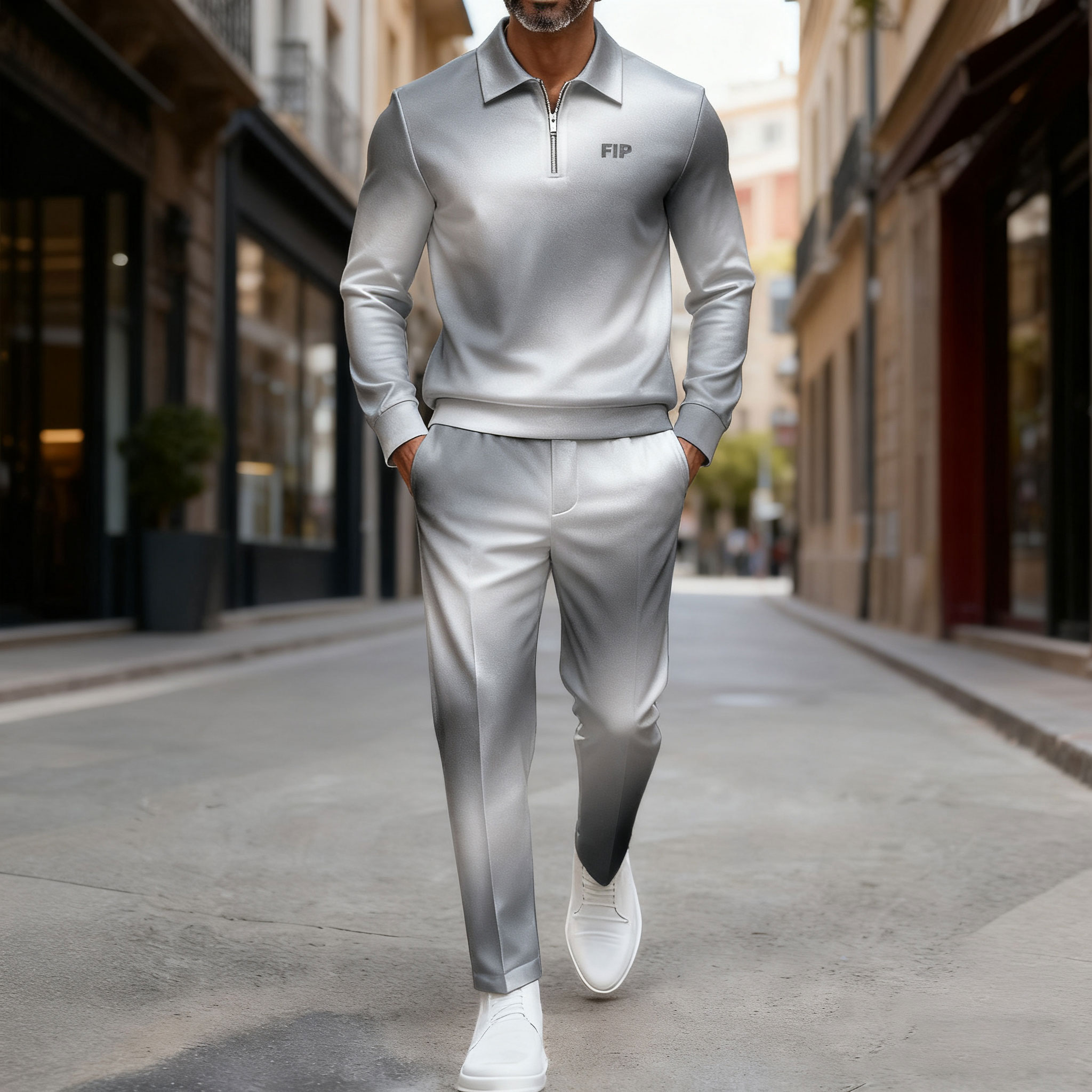 Men's Casual Gray Gradient Color Matching Printed Polo-Collar Zipper Long Sleeved Trousers Two-Piece Set