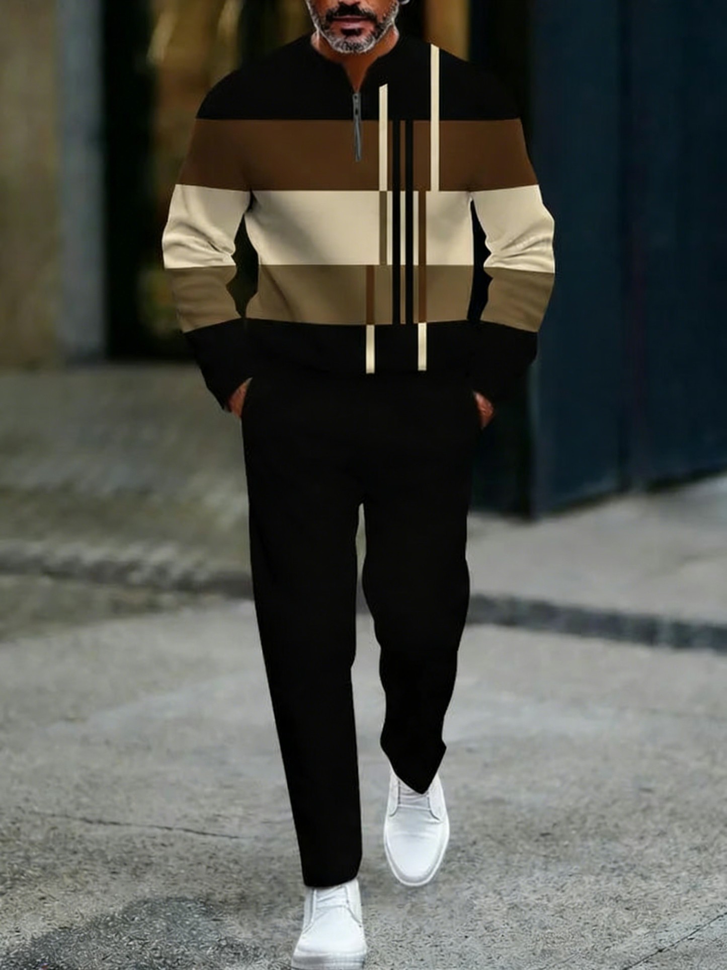 Men's Casual Khaki & Coffee Color Matching Geometric Printed Round-Neck Zipper Long Sleeved Tops & Trousers Two-Piece Set