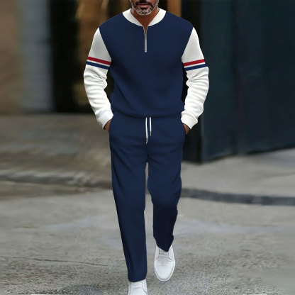 Men's Casual Navy & White Color Matching Round Neck Zipper Long-Sleeve Sweatshirt & Pants Two-Piece Set