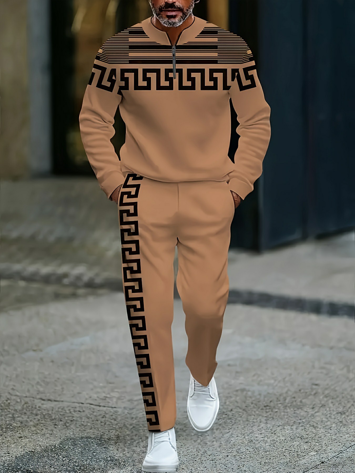 Men's Casual Orange & Black Color Matching Geometric Printed Round-Neck Zipper Long Sleeved Trousers Two-Piece Set