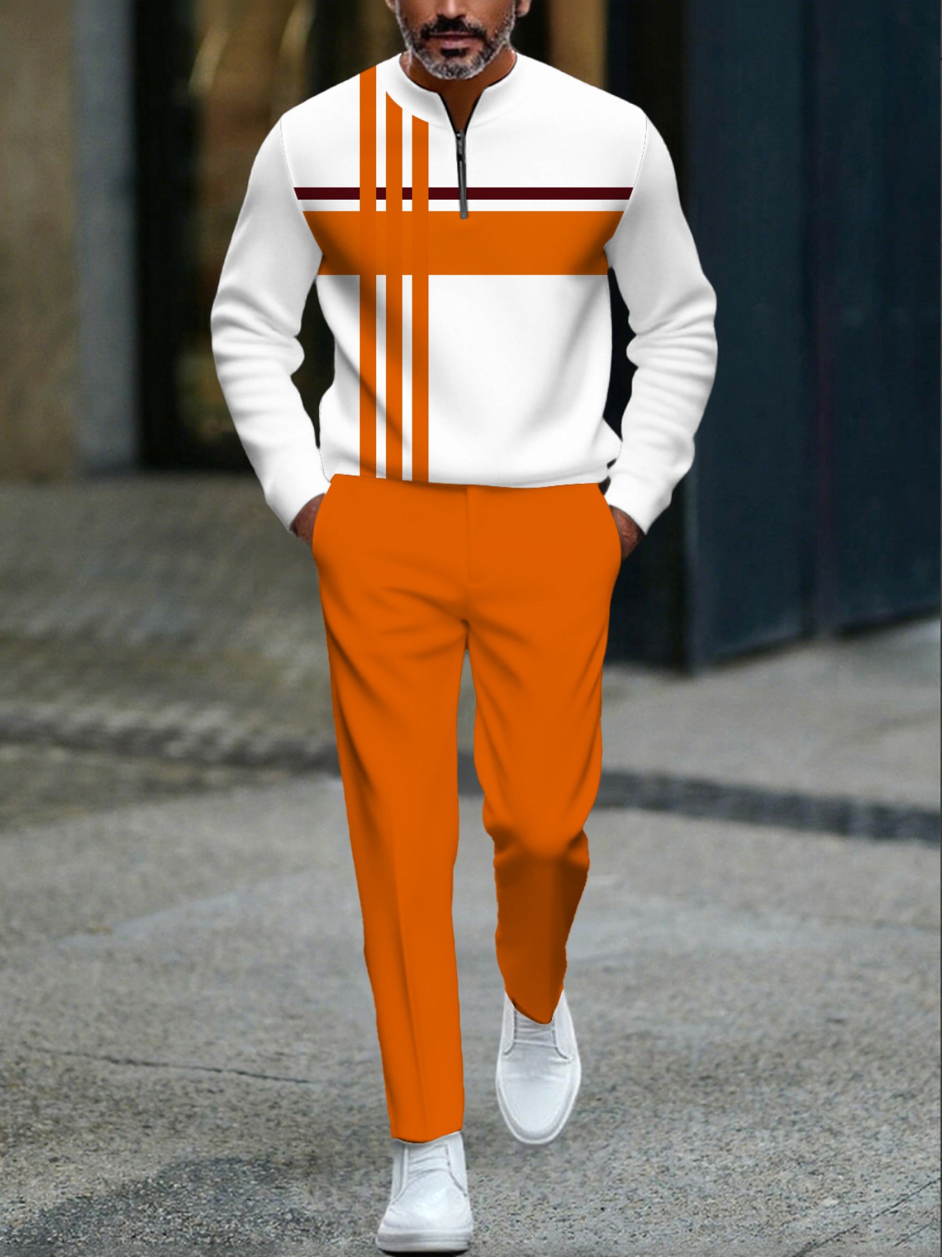 Men's Casual Orange & White Color Matching Geometric Printed Round-Neck Zipper Long Sleeved Tops & Trousers Two-Piece Set