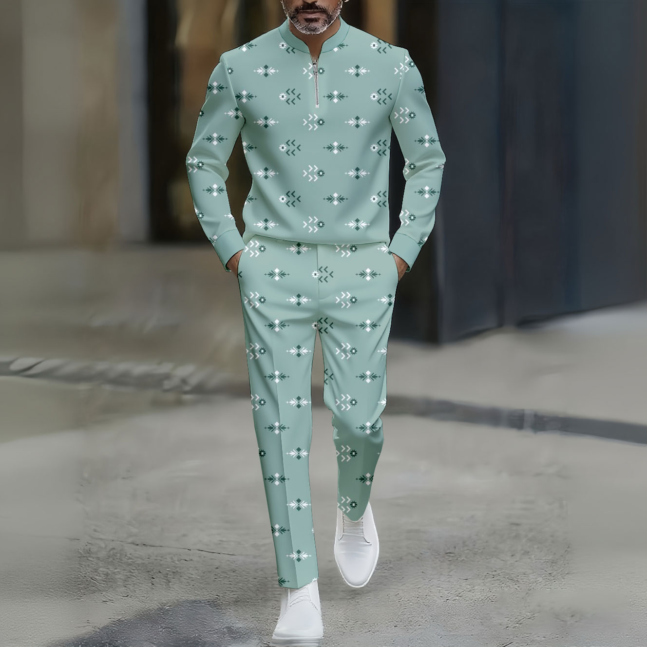 Men's Casual Retro Print Polo Collar Zipper Long Sleeve Pants Two-Piece Set