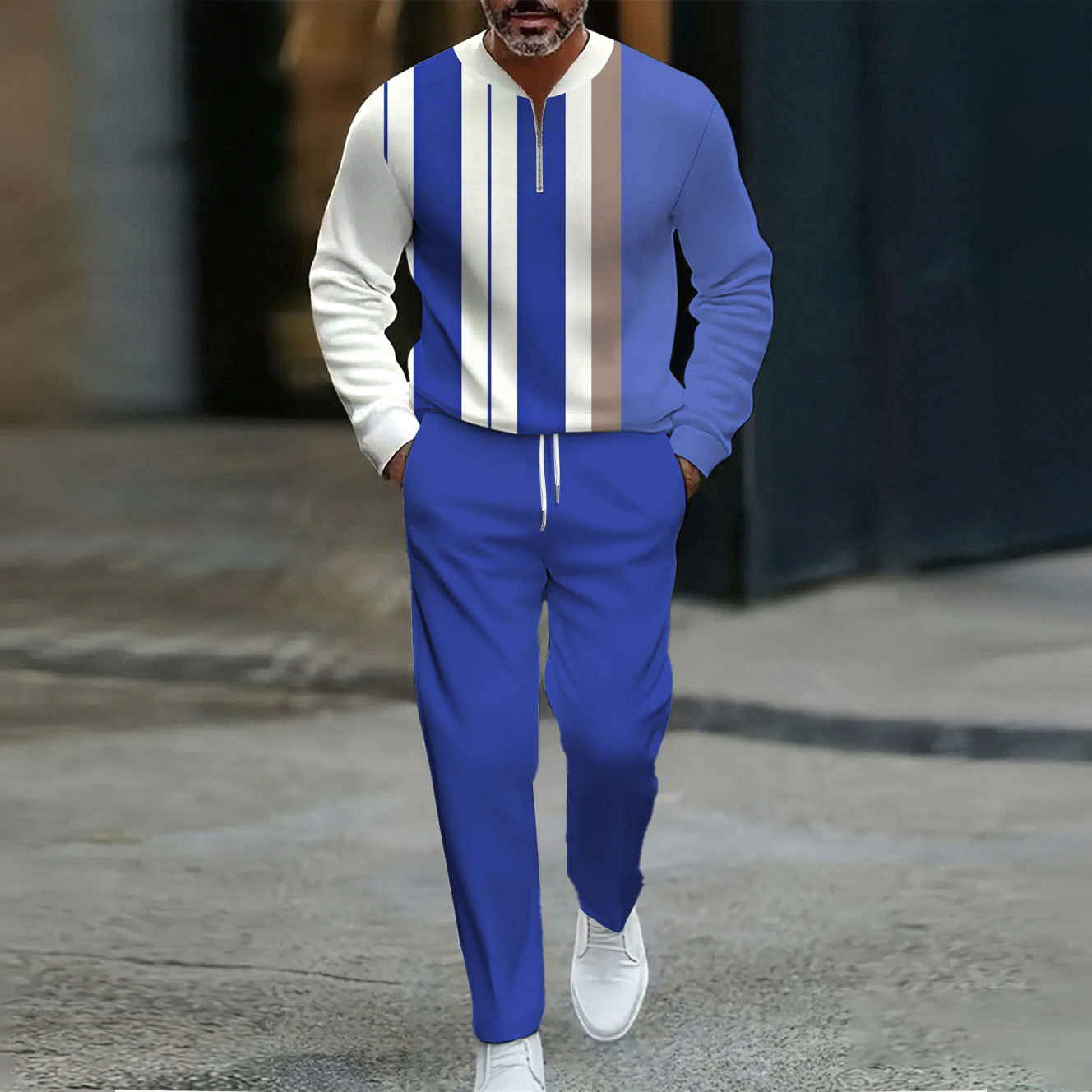 Men's Casual Royal Blue & White Color Matching Striped Printed Round Neck Zipper Long-Sleeve Sweatshirt & Pants Two-Piece Set
