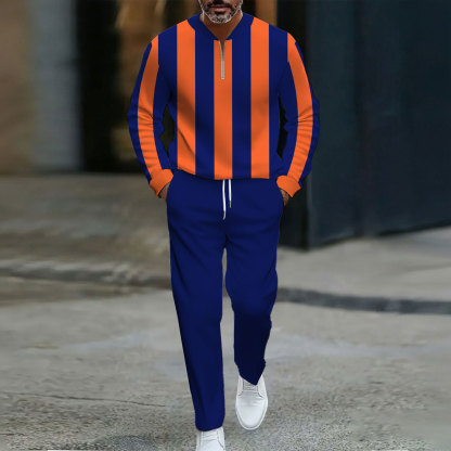 Men's Casual Royal Blue & Orange Striped Color Matching Striped Printed Round Neck Zipper Long-Sleeve Sweatshirt & Pants Two-Piece Set