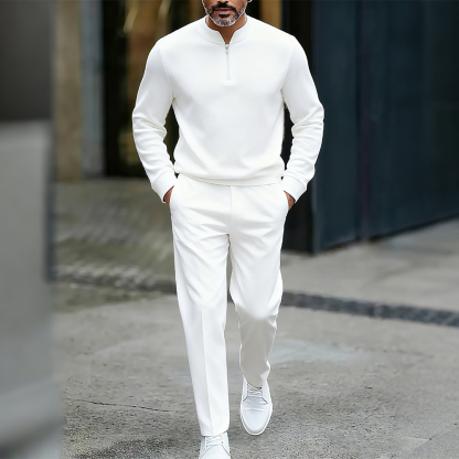 Men's Casual Solid Color Round-Neck Zipper Long Sleeved Trousers Two-Piece Set